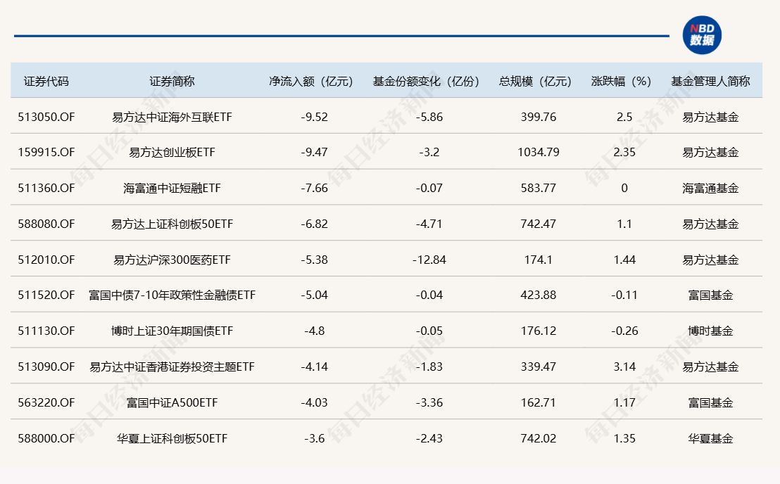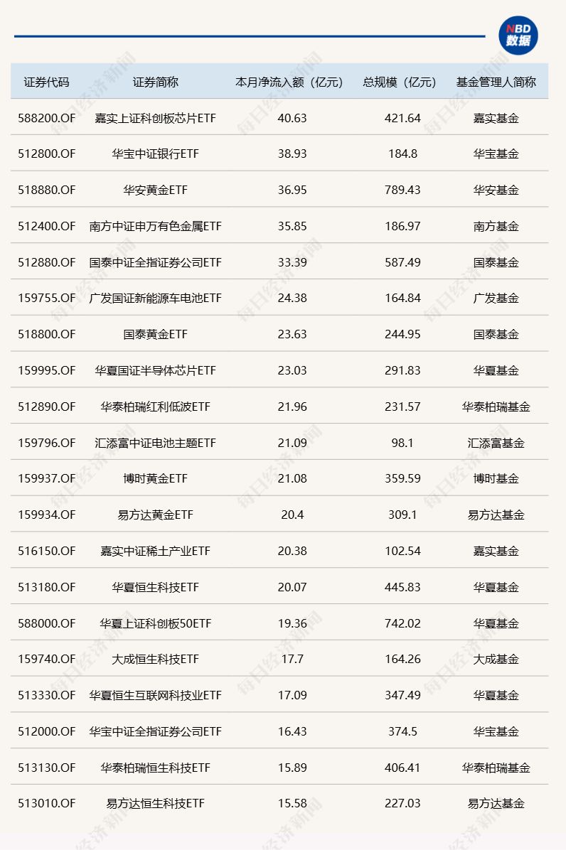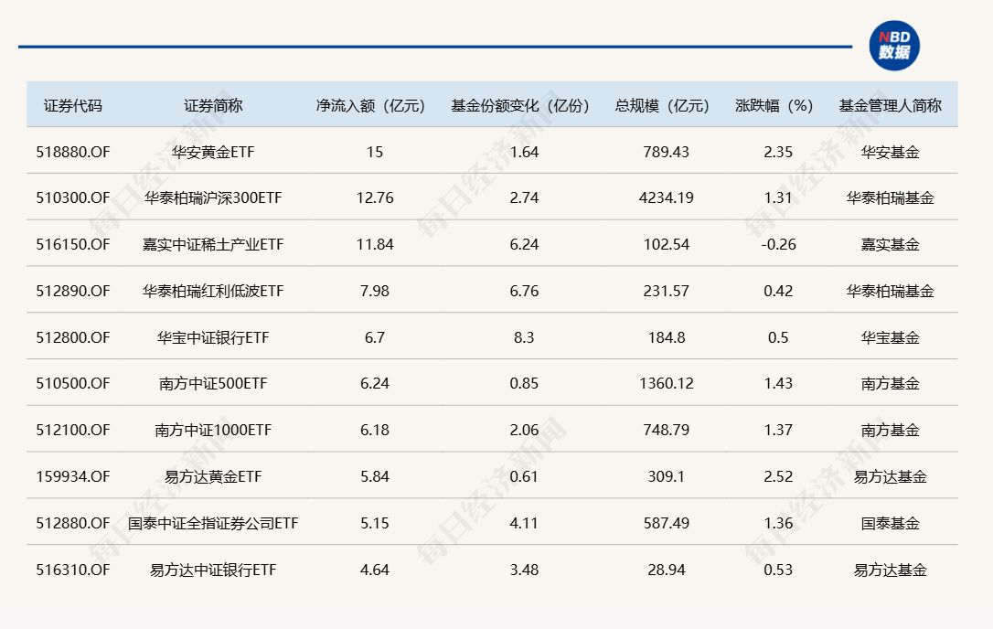 每经记者|肖芮冬 每经编辑|赵云 昨日市场探底回升,沪指涨超1%重回3900点,创业板指探底回升涨超2%。板块方面,汽车、电网设备、医药等板块涨幅居前,港口航运、光刻机等板块跌幅居前。 Wind数据显示,在10月15日非货币ETF市场中,华安黄金ETF基金份额增加1.64亿份,净流入额为15.00亿元;华泰柏瑞沪深300ETF基金份额增加2.74亿份,净流入额为12.76亿元;嘉实中证稀土产业ETF基金份额增加6.24亿份,净流入额为11.84亿元。 与此同时,易方达中证海外互联ETF基金份额减少5.86亿份,净流出额为9.52亿元;易方达创业板ETF基金份额减少3.2亿份,净流出额为9.47亿元;海富通中证短融ETF基金份额减少0.07亿份,净流出额为7.66亿元。 截至10月15日,本月资金净流入额居前20的ETF名单如下: 总体看来,Wind数据显示,10月15日全市场ETF份额为30898.46亿份;总规模为56249.76亿元。近一周,份额增加最大的行业为金融,有24只基金跟踪。份额增加最大的主题为中证电池,有4只基金跟踪。份额增加最大的指数标的为恒生科技,有11只基金跟踪;收益最高的指数标的为稀土产业(+7.85%),有4只基金跟踪。 |