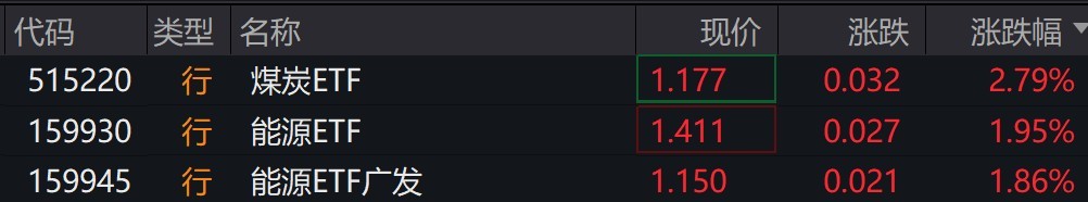 每经记者|叶峰 每经编辑|肖芮冬 煤炭股走强,中煤能源涨超7%,陕西煤业、兖矿能源涨超3%,中国神华、潞安环能涨超2%。 受盘面影响,煤炭ETF涨近3%,能源ETF涨近2%。 有券商表示,当前动力煤和 ...
