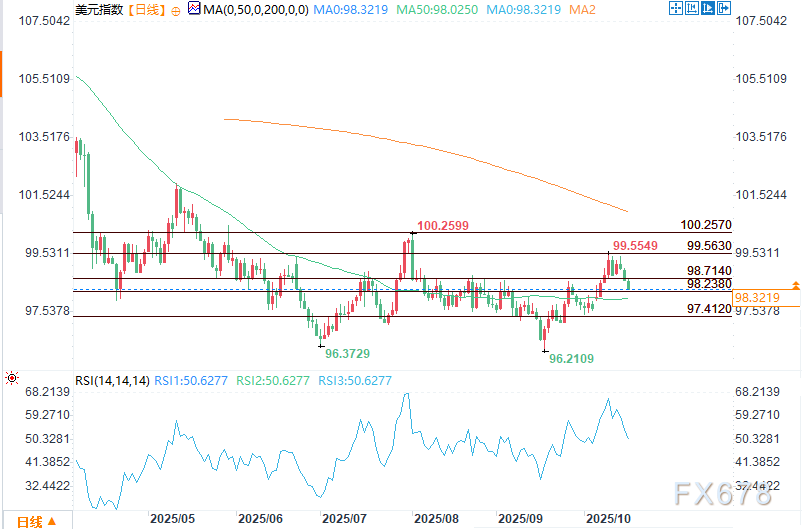 0周四(10月16日)美盘时段,美元指数小幅下跌,跌破98.714这一关键水平,该水平目前已转化为阻力位。下一个重要支撑位为98.238,再往下则是50日均线所在的98.033——若跌破这一关键水平,可能引发更大幅度的市场波 ...