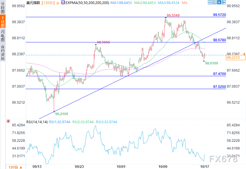 周五(10月17日)欧洲交易时段,美元指数(DXY)进一步下滑至98.21附近,录得连续第四个交易日下跌。美国政府长期停摆、市场对美联储降息的猜测,以及贸易紧张局势再起,均对市场情绪构成压力,投资者仍持谨慎态度。 ...