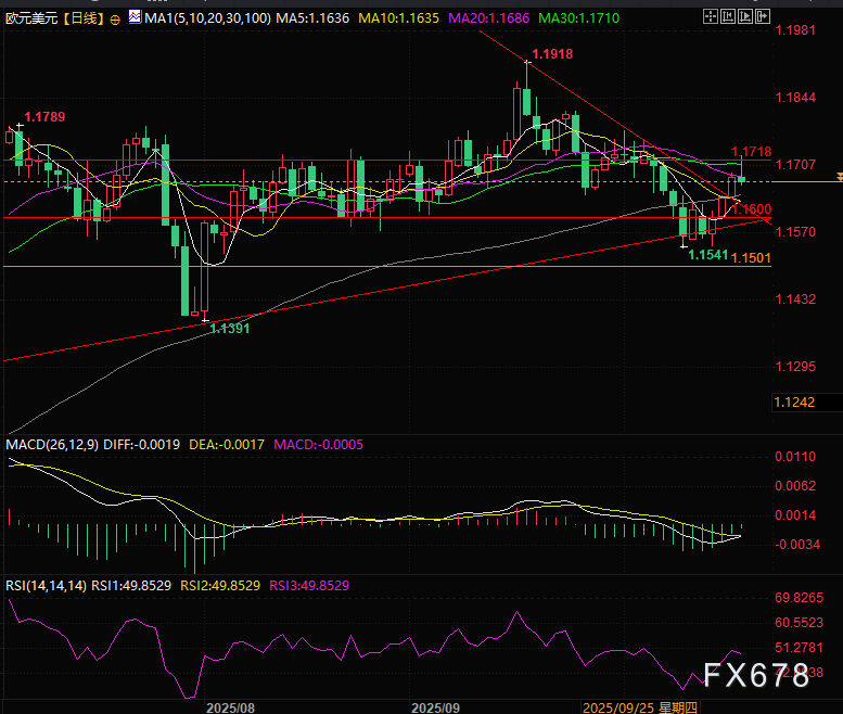 周五亚欧时段,欧元兑美元在美股开盘前回吐日内涨幅,目前交投于1.1677附近,日内早些时候曾触及1.1727高点。尽管如此,该货币对兑由于美元的走软仍有望实现0.6%的周度涨幅。 ![]() 周五公布的欧元区数据显示,9月消费者物价环比上涨0.1%,与8月持平;同比通胀增速从上月的2%升至2.2%。值得注意的是,核心调和消费者物价指数(HICP)同比涨幅从先前预估的2.3%上修至2.4%,为今年4月以来的最高水平。 上述数据印证了欧洲央行(ECB)官员文施与科赫尔周四的表态——两人均指出,欧洲央行或已处于降息周期尾声,或已非常接近这一节点。 周四,欧洲央行行长皮埃尔·文施表示,进一步降息的可能性正逐步下降;而欧洲央行行长马丁·科赫尔则确认,央行“已处于降息周期尾声,或已非常接近尾声”。 贸易局势、美联储降息信号压制美元走势 受中美贸易局势持续发酵、美联储未来数月可能多次降息的信号不断增多,以及政府拨款谈判毫无进展(意味着美国政府停摆或将持续较长时间)等因素叠加影响,虽然周五晚上特朗普在社交平台上关于贸易的发言短期提振了美元但美元料依然将创下数月来最差单周表现。 本周早些时候,美联储《褐皮书》进一步对美元构成压力,报告明确警示美国经济正面临放缓风险:消费者支出开始显现疲软迹象,劳动力市场呈现停滞态势,企业则对经济前景的不确定性及关税上调的影响表达担忧。 法国政局缓和短期支撑欧元 过去几个交易日,欧元呈现小幅走高态势,原因是投资者对法国近期政治不确定性的消除松了一口气。勒科尔尼在意外辞职后重新被任命为总理,同时总理塞巴斯蒂安·勒科尔尼周四顶住两次不信任投票,这一结果缓解了市场对法国政治前景不确定性的担忧,也为欧元提供了额外支撑。 同时受美联储进一步降息预期的显著压制,美元上涨空间有限。美联储理事克里斯托弗·沃勒周四明确表示,支持10月再实施一次降息;而特朗普近期提名的美联储理事会成员斯蒂芬·米兰则重申,有必要采取更激进的降息操作。 他在2026年预算案上做出的让步获得了社会党人的积极回应,这也使得政府的预算法案有望顺利完成立法程序。不过,重大挑战依然存在,尤其是延迟提高退休年龄的问题——法国当前退休年龄定为62岁,且至少要到2028年1月才会调整(目前为欧盟成员国中并列最低水平),他仍需在年底前推动紧缩预算案在分歧严重的议会中获得通过,这仍是一项艰巨挑战。 这一情况对欧元区而言并非长期利好信号,因为在政府分歧严重的背景下,当局若无法通过此类关键养老金改革,将导致纳税人承担更重负担,以支撑日益失衡的人口结构(老年人口占比过高)。 这不仅可能推升债务的风险溢价,还将限制政府通过扩大财政支出支撑经济增长的政策空间。 技术分析: 之前讲过1.1600是多空分界线,欧元兑美元守住1.1600后直接继续上涨突破了下降压力线。 目前受20、30日均线压制,短期重拾了上涨形态,支撑在1.1600和下降压力线上。 压力在1.1720附近的前期成交密集区。 ![]() 北京时间21:09,欧元兑美元现报1.1675/74。