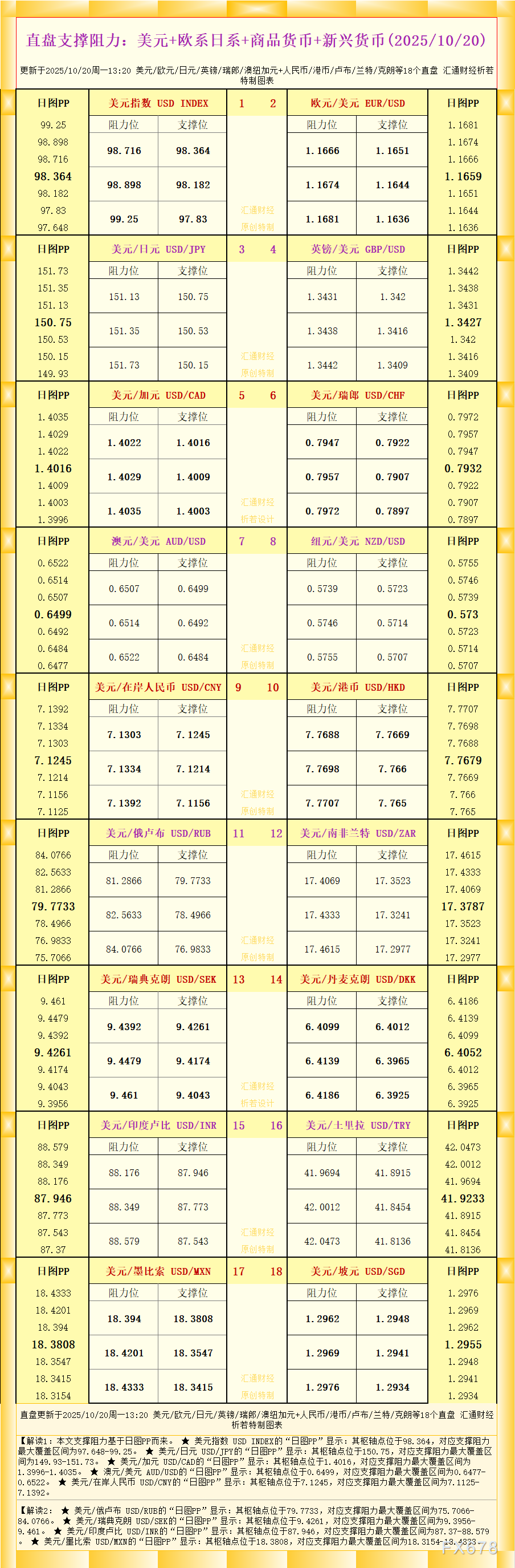 0一张图看直盘支撑阻力:美元+欧系日系+商品货币+新兴货币,更新于2025年10月20日周一13:20,具体美元/欧元/日元/英镑/瑞郎/澳纽加元+人民币/港币/卢布/兰特/克朗等18个直盘,更多详见汇通财经析若特制图表中的内 ...