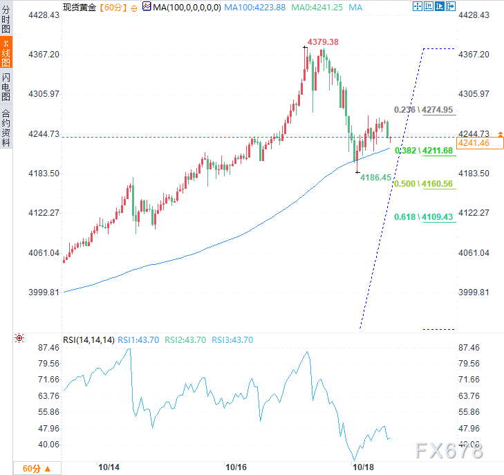 周一(10月20日)曾一度冲高至4274.53美元/盎司的高位,而后回落,现货黄金现于4240美元/盎司附近震荡,跌幅约0.16%,延续此前从上周五历史高点(4379.38美元/盎司)回落的跌势。 ![]() 多重利好支撑下黄金多头仍显踌躇 尽管存在诸多支撑因素,黄金多头目前仍持谨慎态度,其背后存在多重市场动态: 贸易局势现缓和信号:特朗普总统上周五宣称实施全面关税不可持续,该表态引发避险黄金的获利了结,但回调走势未形成持续动能。 地缘政治风险持续发酵:乌克兰无人机袭击俄罗斯南部国有天然气加工厂及萨马拉地区炼油厂,俄乌冲突升级风险依然存在。 美国政治僵局难解:联邦政府停摆已进入第20天,共和党与民主党就医疗补贴问题持续对峙。参议院将于本周一就权宜支出法案进行第11次投票,政治僵局仍未打破。 货币政策预期支撑金价:据CME美联储观察工具显示,市场已完全定价美联储将在10月与12月政策会议上各降息25个基点。这压制了美元反弹空间,巩固了非生息资产黄金的吸引力。 市场关注焦点转向:随着10月FOMC政策会议临近,美联储官员已进入静默期。市场正等待周五将公布的美国最新通胀数据,在此之前可能保持观望。 金价在4225-4205美元共振支撑位上方似乎有望延续涨势 从技术面看,现货黄金上周五在4225-4205美元共振支撑带附近展现出韧性——该区域同时汇聚100小时简单移动平均线(SMA,4223.88)和10月9日至17日涨势的38.2%斐波那契回撤位(4211)。 上行方面,后续上行将在23.6%斐波那契回撤位(4275美元)附近遭遇阻力。该水准目前已成为日内关键枢轴点,若有效突破,金价可能进一步攀升至4300美元上方,向4325美元水平阻力位迈进。若动能持续,或将重新测试上周五触及的4379.38美元的历史高点。 下行方面,亚市时段低点4219-4218美元区域将在4200美元整数关口与上周五波动低点4186美元之前为金价提供初步支撑。若跌破4163-4162区域(即50%回撤位),金价可能加速滑向4100美元关口。该位置恰与61.8%斐波那契回撤位重合,一旦有效跌破,则暗示黄金已构筑阶段性顶部,并为更深度的回调打开空间。 ![]() 北京时间14:24,现货黄金现报4238.92美元/盎司。