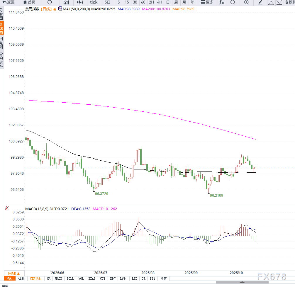 周一亚洲早盘,美元指数(DXY)小幅回落至约 98.40,延续上周涨幅的回撤。美元近期承压主要受美国政府关门拖延和美联储潜在降息影响。 ![]() 美元进一步承压的原因还包括市场对美联储降息的高度预期。CME FedWatch 工具显示,10月降息的概率接近 100%,12月再次降息的概率约为 96%。 圣路易斯联储主席 Alberto Musalem 在国际金融协会年会表示,如果就业面临更多风险且通胀得到控制,他支持进一步降息。他强调美联储不应预设路径,应采取平衡策略。 近期全球贸易关系出现缓和迹象,有助于改善市场情绪,从而限制美元的下行空间。美国总统表示,期望亚洲国家至少恢复大豆购买规模,并相信双方将在大豆贸易上达成协议。 分析指出,贸易担忧情绪缓和有望减轻美元承压,但短期美元走势仍需关注政策和政治风险。 整体来看,美元短线承压明显,但若贸易谈判出现实质性进展或政府停摆得到解决,美元可能获得一定支撑。 从日线图来看,美元指数近期在 99.00附近遇到明显阻力,多次未能有效突破,形成短期头肩顶迹象。下方支撑位在 98.20–98.30 区间,若持续下破,可能开启更深幅度回调。 技术指标显示,相对强弱指数(RSI)已从高位回落,显示多头动能减弱,而 MACD 柱状图也出现缩量,暗示短线调整压力增加。整体来看,美元指数正处于高位震荡整理阶段,短期内可能维持 98.20–99.00区间波动,等待政策与消息面方向确认。 ![]() : 美元当前面临多重下行压力:政府关门历史性延长、市场降息预期升温以及避险需求波动。重点关注政策消息面和全球贸易进展,同时结合美元指数与主要货币走势,动态调整风险敞口。市场短期可能延续震荡,但中长期趋势仍取决于政策和全球风险情绪演变。 ![]() |
