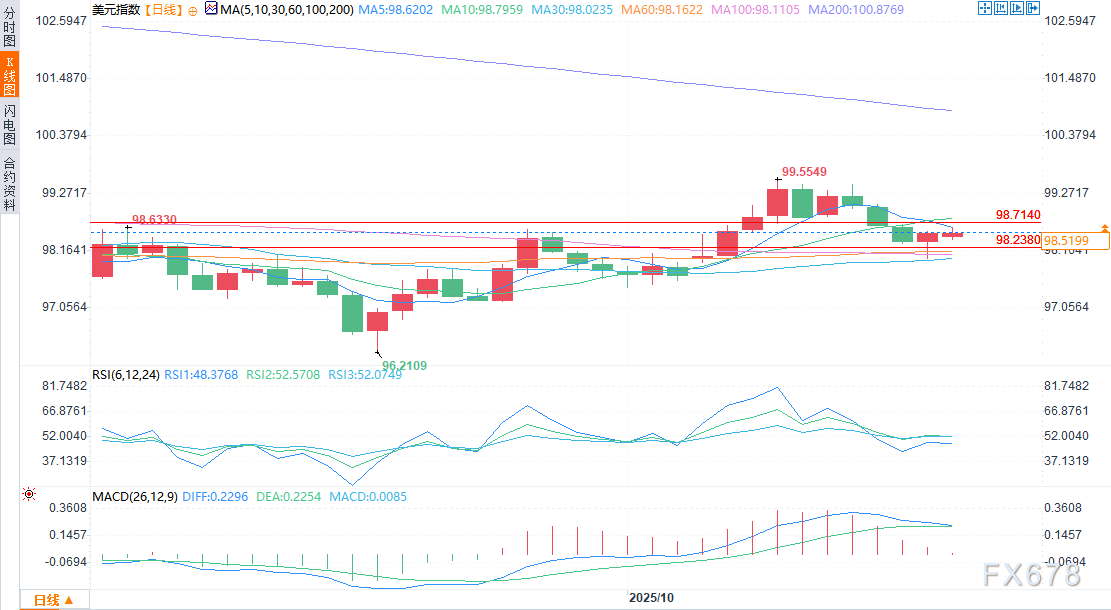 周一(10月20日)美盘时段,美元指数(DXY)小幅走低,测试98.238至98.714之间的关键技术区间。价格走势始终局限在这一回调区间内,交易员同时权衡日本和欧洲的政治动态、中美贸易关系企稳的信号,以及债券市场的谨 ...