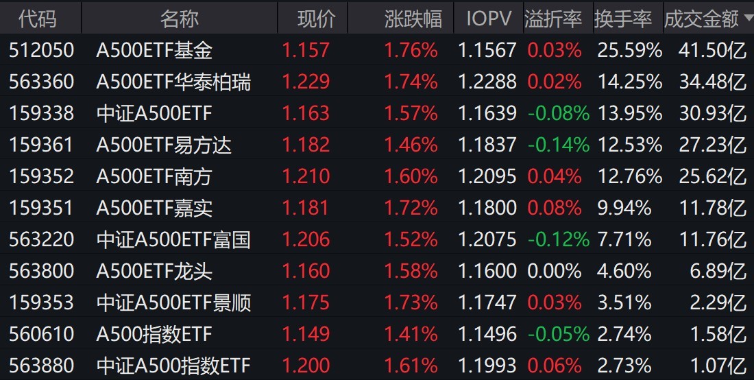 每经记者|叶峰 每经编辑|肖芮冬 市场早盘震荡反弹,中证A500指数上涨1.6%,全市场近4600只个股上涨。 盘面上,算力硬件概念延续强势,苹果产业链表现活跃,存储芯片概念大幅拉升。下跌方面,煤炭股多数下跌。 截至上午收盘,场内跟踪中证A500指数的ETF涨超1%。其中,有11只中证A500相关ETF成交额超1亿元,3只超30亿元。A500ETF基金、A500ETF华泰柏瑞、中证A500ETF早盘成交额分别为41.5亿元、34.48亿元、30.93亿元。 有券商表示,市场政策预期升温,叠加美联储年内仍有降息空间,将对市场形成支撑。当前A股市场可能继续呈现蓄势震荡的特征,在国内政策预期升温与三季报业绩验证的支撑下,结构性机会依然丰富。科技成长仍是市场中长期主线,在良性调整期间宜择优布局。 |