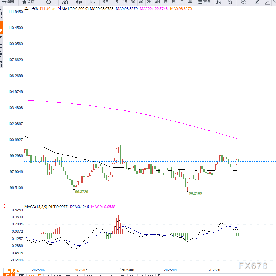 美元指数(DXY)在周三欧洲时段下行至约98.90,延续此前三日上涨后的承压走势。美元下跌主要受到美国政府关门及政策不确定性影响。 ![]() 机构观点:据市场调查显示,美联储基金利率期货几乎完全定价10月29日会议降息25个基点的可能性,短期利率预期升温体现了市场对美元的压力。 另一方面,全球贸易情绪出现积极迹象,为美元提供一定支撑。 日线来看,美元指数短线承压,关键支撑位关注98.70,次级支撑位在98.20。阻力位关注99.20及99.50。技术指标显示短期偏弱,但若守住支撑区间并伴随贸易谈判进展,可能出现反弹机会。 MACD有回落迹象,RSI从高位回落至50附近,表明短线震荡偏弱。 ![]() 美元短期承压主要因政府关门及政策不确定性。市场对经济数据缺失与降息预期反应敏感,短线偏弱格局明显。但全球贸易情绪缓解部分下行压力。关注98.70支撑位的稳固情况,以判断短期美元反弹或进一步调整的方向。
