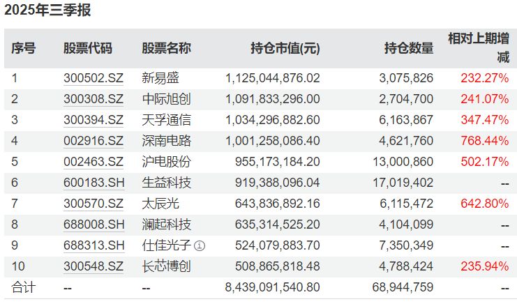 每经记者|黄小聪 每经编辑|叶峰 今日,更多基金三季报出炉,其中也包括了目前排在业绩榜第一位的永赢科技智选,记者注意到,该基金在三季度累计申购量超过了100亿份,虽然同时也有超70亿份的赎回,但整体规模依然获得大幅增长。 从持仓来看,重仓方向依然是CPO板块,个股上的主要调整是胜宏科技、工业富联、源杰科技退出前十大。 除了这只基金外,永赢旗下多只三季度新成立的产品,也出现了规模大幅增长的情况。另外,在智选系列产品的三季报中,均出现了统一的风险控制提醒。 申购超百亿份,持仓聚焦CPO 今日,永赢科技智选披露了2025年三季报,这只基金截至今年9月底,前三季度累计收益超过190%,亮眼的业绩吸引了诸多投资者的关注。 从三季度的申赎情况来看,三季度A类和C类份额累计获得超100亿份的申购,其中C类份额单季度申购超过92亿份。虽然同时也有超70亿份的赎回,但C类份额在三季度依然获得大幅增长,从期初的6.2亿份大增至期末的27.8亿份。 随着规模大增,基金经理继续加仓,从前十大重仓股来看,大部分的持仓数量都有大幅增加,主要的持仓方向依然是CPO板块。 其中比较明显的变化在于胜宏科技、工业富联、源杰科技退出前十大,生益科技、澜起科技、仕佳光子新进前十大。 多只新基金三季度规模大增 除了这只基金,永赢智选系列的其他多只基金也披露了三季报,且出现了规模大幅变化的情况。 比如永赢先锋半导体智选混合,这只今年三季度刚成立的新基金,在成立之后的半个多月时间里,C类份额就获得了超2.3亿份的申购,规模也直接增长到了2.9亿份。 而从持仓来看,该基金成立仅半个多月,股票仓位占基金总资产的比例就已经达到87.97%,可见其建仓速度还是非常快。主要配置方向是存储芯片产业链。 再看永赢新材料智选混合,三季度其规模变化同样明显,这也是一只今年三季度才刚成立的新基金,C类份额成立时不到200万份,成立后获得了超9.5亿份的申购,期末份额大幅增长到约5.89亿份。 另外,同一天成立的永赢港股通科技智选混合,成立之后仅2个多月时间,C类份额申购超16亿份,期末份额直接突破了10亿份。 统一提示风险控制 值得注意的是,尽管这些产品的基金经理不太一样,但在这些产品的三季报中,都出现了相同的风险提醒,显然是公司的统一动作。 永赢基金表示:“永赢智选系列作为工具型产品系列,所布局的行业有高成长性的特性。但不要用过去的业绩去预测未来,任何风险资产都不是只涨不跌的,要当心估值扩张周期后的均值回归。” “过去几个季度以来,我们一直和大家强调理性对待工具型产品。这一年以来,市场热度不断攀升,而越是这种时候,越是要做好投资适当性的管理,理性决策。第一,投资之前,做好风险控制。90%的风险控制都在投资动作之前,风险敞口在买入瞬间已被锁定,后续操作(如止损)仅是补救,无法改变初始决策的缺陷。通过了解基金所投行业及相关行业所处阶段,预估未来可能面对的波动幅度,从而判断产品是否适合自己。” “第二,合理配置,做好风险分散。工具型产品不可避免具有高弹性特征,需要适当分散投资,不要把资金全部押注到单一产品,从更理性、更长期的角度做好资产配置。” “第三,不试图预测市场短期涨跌。影响市场短期走势的因素比较复杂,市场也充满了不确定性,试图精准预测的难度不亚于大海捞针。短期择时往往会对账户造成负收益,对于看好的行业不妨给它更长时间,不折腾才能提高真实收益。” 封面图片来源:每日经济新闻 |