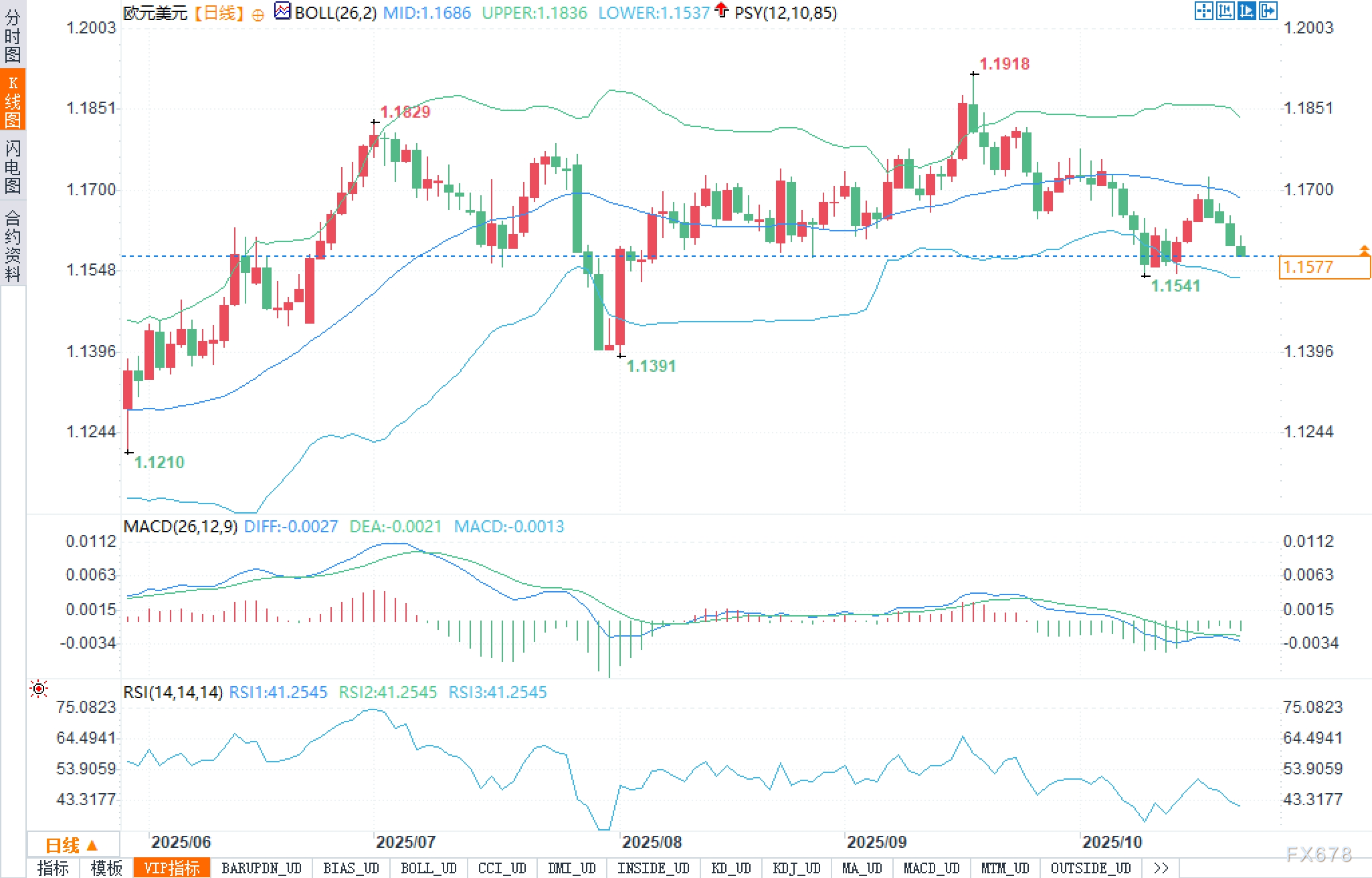 周三(10月22日),欧元兑美元北美时段交投于1.15上方。下周欧洲央行例会被普遍视作“流程会”,难以对趋势留下持久烙印;市场更关注12月的政策指引是否释放新的宽松信号。技术上,汇价刚好压在布林带下沿之上,情绪上偏谨慎,基本面上的争论则推迟到12月才可能见分晓。 ![]() 信息增量有限。 自9月议息以来,欧元区数据更新既稀疏又互相抵消。9月PMI和经济景气指标略有回升,但8月的消费与工业产出偏弱。通胀一度重回2%上方,但缺乏连续的“新证据”,而且关键的通胀、三季度GDP预估与情绪调查多在议息当天才公布,难以在本周形成可操作的共识。 短期无迫切性。 法国政治风险暂未进一步升级,法债利差未再明显扩张,当前金融环境并未逼迫欧洲央行动用传导保护工具(TPI)。既然9月已进入“观望模式”,下周或更无推力改变政策轨道。 鹰鸽暂时停火,目标对准12月。 官员表态总体回到“在一个不错的位置”的基调:一方面强调维持现水平以防通胀回潮;另一方面也有声音认为下一步“升降机率相当”。这更像是一种默契——12月再定生死。 12月仍存降息选项。 若美元外部冲击(关税延后效应)持续、欧元走强压低进口通胀、法国政治再生波折或德国财政刺激落地延迟,欧洲央行可能被动再小幅下调一次或两次利率。同时,通胀远期预测还嵌入了ETS2机制约0.2个百分点的上行影响;若该机制推迟实施,通胀中枢面临下修风险——12月更新的2028年通胀预测若低于1.7%,降息概率将抬升。 技术面: 日线图显示,布林带中轨在1.1686、上轨1.1836、下轨1.1537。当前汇价紧贴下轨上方,表明短线处于下行通道的下缘。过去一段时间的高点分别在1.1829与1.1918,低点依次为1.1541、1.1391与1.1210,形态上构成下降趋势中的连续下台阶。 MACD(26,12,9) 的DIFF约-0.0027、DEA约-0.0021、柱状图约-0.0013,仍在零轴下方小幅扩阴,显示动能偏弱但未大幅放大;一旦柱体继续放大且DIFF下穿DEA形成加速,则可能触发对1.1541/1.1537区域的回测。 ![]() 由此,关键支撑:1.1541—1.1537,进一步为1.1391与1.1210;重要阻力:1.1686、1.1836,强阻力位于1.1918。