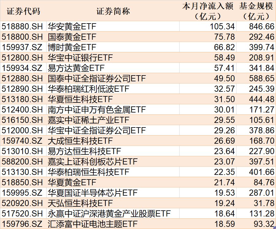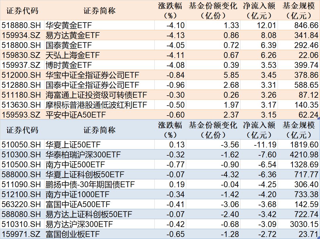每经记者|叶峰 每经编辑|彭水萍 昨日市场全天弱势震荡,三大指数盘中翻红后均出现回落。盘面上,深地经济概念股全天走强,油气股午后爆发,银行板块逆势上涨。下跌方面,电池股集体走弱。 Wind数据显示,在10月22日非货币ETF市场中,华安黄金ETF基金份额增加1.33亿份,净流入额为12.01亿元;易方达黄金ETF基金份额增加0.86亿份,净流入额为8.08亿元;国泰黄金ETF基金份额增加0.72亿份,净流入额为6.39亿元。 与此同时,华夏上证50ETF基金份额减少3.56亿份,净流出额为11.19亿元;华泰柏瑞沪深300ETF基金份额减少1.62亿份,净流出额为7.60亿元;南方中证500ETF基金份额减少0.90亿份,净流出额为6.54亿元。 截至10月22日,本月资金净流入额居前20的ETF名单如下: 总体看来,Wind数据显示,截至10月22日,全市场ETF份额为31082.38亿份,总规模为56151.91亿元。份额增加最大的行业为金融,有24只基金跟踪。份额增加最大的主题为中证机器人指数,有9只基金跟踪。份额增加最大的指数标的为证券公司,有13只基金跟踪;收益最高的指数标的为油气资源(+1.03%),有3只基金跟踪。 封面图片来源:每日经济新闻 |