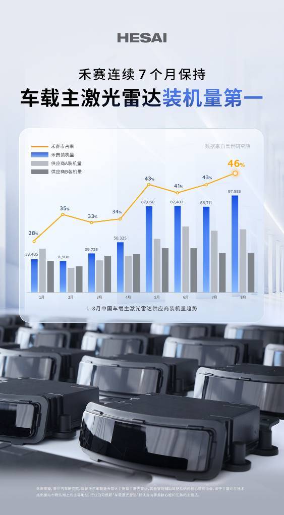 本周,盖世汽车研究院发布了 2025 年 1-8 月车载激光雷达装机量排行榜。榜单显示,8 月份禾赛车载主激光雷达装机量继续稳居行业第一。禾赛已连续 7 个月主激光雷达市占率第一并保持高速增长,市场占有率已上升到 46% ...