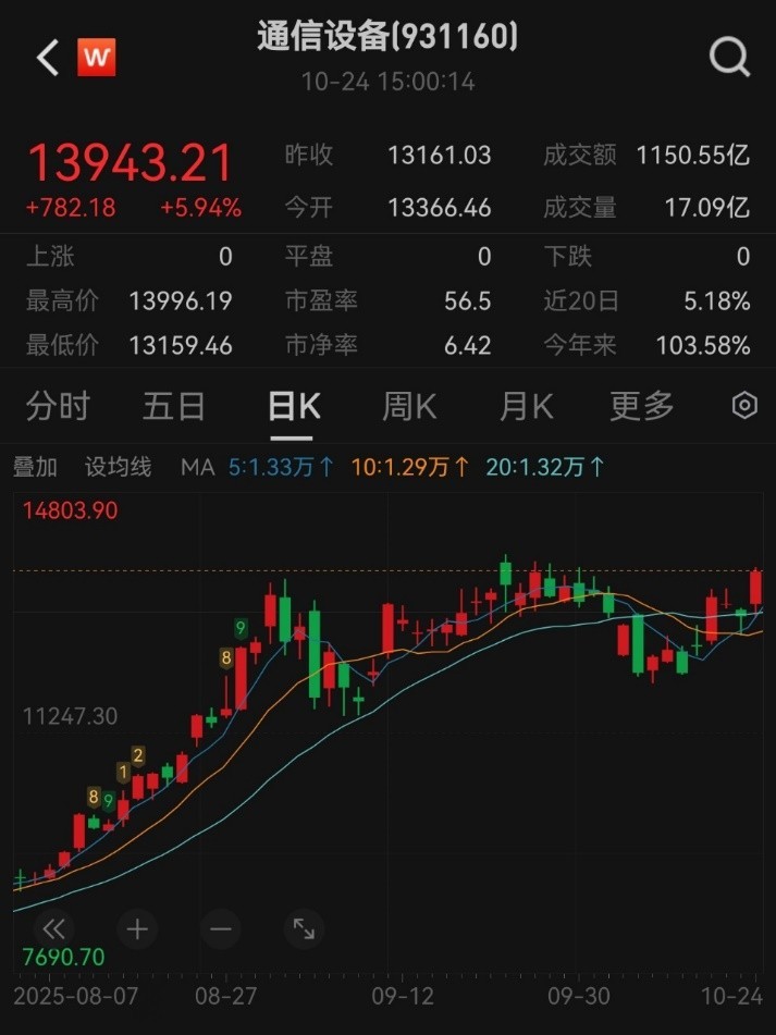 10 月 24 日,通信设备指数(931160)跟随 A 股大科技板块强势走高,在市场整体放量上涨的行情中实现显著上行,截至收盘,涨幅5.94%。此次指数走强一方面受益于 AI 算力需求增长带动光模块等细分领域景气度提升,另一方面叠加市场对通信设备行业政策红利与技术突破的预期,板块整体呈现出强者恒强的结构性特征。