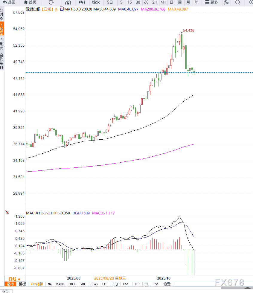 白银(XAG/USD)在周一亚洲交易时段下跌约1.5%,重回48美元下方。价格承压的主要原因是市场对全球贸易局势的乐观预期升温。 ![]() 整体来看,白银价格正面临避险需求下降与利率预期波动的双重影响,短期行情方向存在不确定性。 据市场调查显示,多家机构认为,白银短线承压主要受市场情绪变化影响,基本面支撑有限,但美联储降息预期仍可能在关键支撑位附近提供回升机会。 分析师指出:“白银正处于震荡区间,避险需求回落压制价格上行,但降息预期仍为非收益资产提供底部支撑。” 日线图显示,白银近期从上周高点54.85回落,短期趋势不明。价格持续未能收复20日指数移动平均线(EMA)约48.86美元,同时14日相对强弱指数(RSI)跌破60,显示短期多头动能已减弱。 下方关键支撑仍看9月23日低点44.47美元,上方短期压力位于近期高点54.50美元。整体技术结构偏向震荡承压,短线价格可能在48-50美元区间反复整理。 ![]() 白银短期走势受市场情绪与美联储政策预期双重驱动。全球贸易局势乐观情绪降低避险需求,但降息预期为白银提供底部支撑。短期偏震荡调整为主,等待企稳。