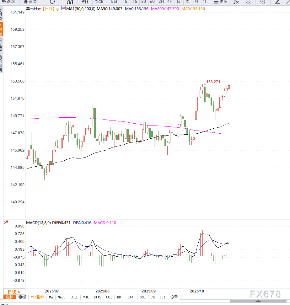 周一亚洲交易时段,日元延续下行趋势,对美元创两周低点。市场担忧日本新任首相Sanae Takaichi将实施扩张性财政政策并延缓紧缩步伐,这对避险日元形成压制。 ![]() 据市场调查显示,日本服务业生产者价格指数9月上涨至3.0%,高于8月的2.7%,显示通胀高企,但新首相的亲刺激政策让市场对进一步政策收紧心存疑虑。 美联储降息预期增强也抑制美元反弹,从而支撑低收益日元并限制USD/JPY上行空间。 分析师指出:“日元短线承压,投资者在美联储和BoJ关键会议前保持谨慎,短线应关注153.25美元阻力和152.65美元支撑。” 从技术面来看,USD/JPY若突破153.25–153.30美元阻力位,将触发新一轮多头买盘,可能进一步上攻至154.00美元关口,随后目标关注154.75–154.80美元及155.00心理位。 下方支撑位集中在亚洲时段低点152.65美元,跌破后可能滑向152.25美元及152.00美元,若进一步失守,则可能测试151.10–151.00美元支撑区域。整体日线振荡偏多,但短期仍需关注关键支撑与阻力位变化。 ![]() 日元短线走势受日本财政政策预期及全球贸易缓和影响。投资者在美联储及BoJ关键会议前谨慎观望,短线重点关注153.25美元阻力及152.65美元支撑。整体震荡偏多,但需警惕突破失败带来的回调风险。