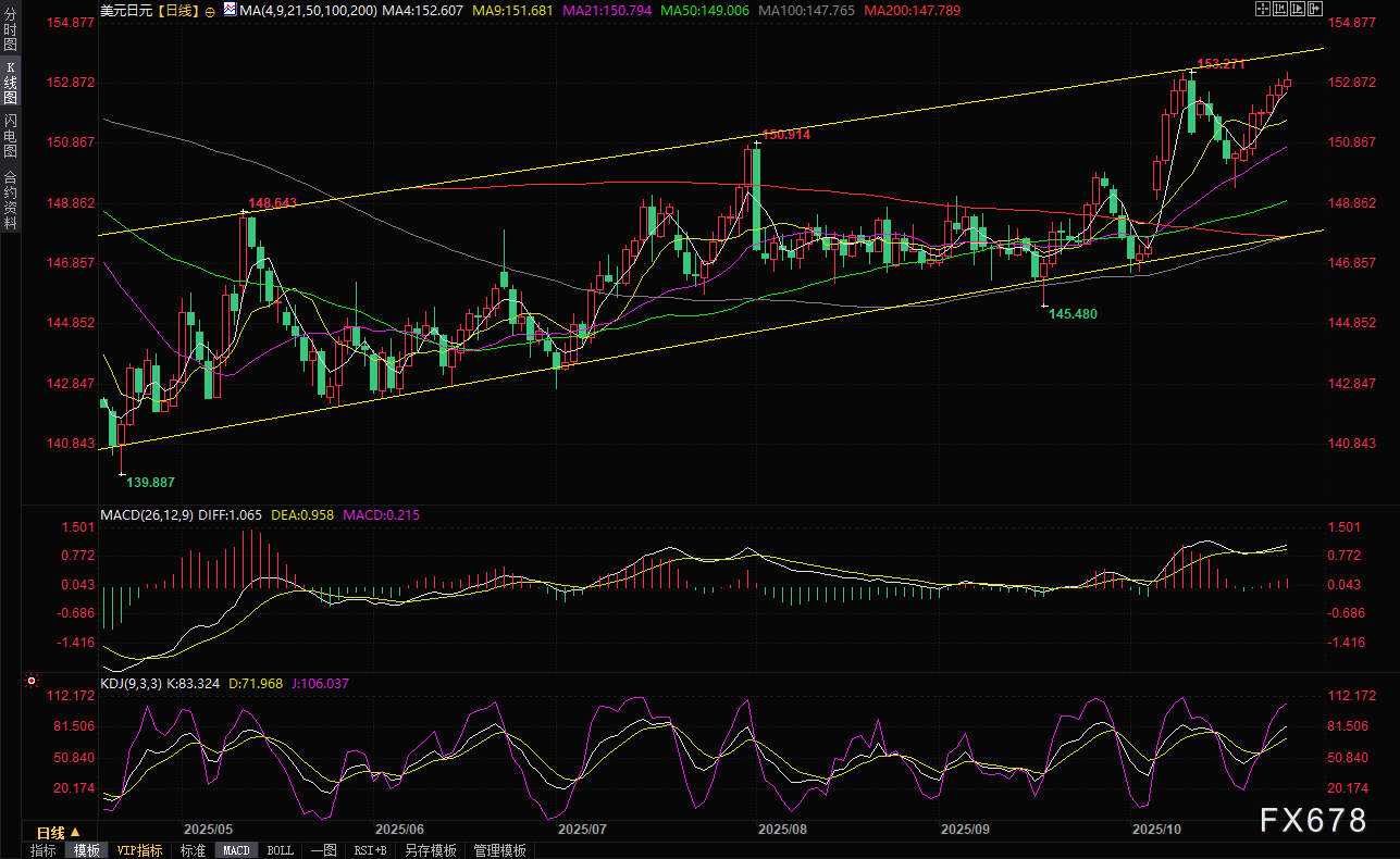 日元(JPY)兑美元连续第七天下跌,因市场预期日本新首相高市早苗将推行扩张性支出政策并抵制早期收紧政策。此外,中美贸易紧张局势缓和的迹象也削弱了避险日元的需求,推动美元/日元在周一(10月27日)亚洲时段升至两周多高点,最高触及153.25,接近10月10日创下的近八个月高点153.27;目前小幅回落至153.05附近。 ![]() 周一早些时候发布的数据显示,日本9月服务业生产者价格指数连续第二个月上升,从8月的2.7%加速至3.0%。日本消费者通胀已连续三年多超过日本央行2%的目标,最新数据支持央行进一步收紧政策的理由,但这对提振日元作用甚微。 日本新首相高市早苗被视为前首相安倍晋三经济政策的继承者,以支持刺激政策著称。这引发了对日本财政健康的担忧,并为日本央行进一步收紧政策的前景蒙上阴影,从而限制了日元多头激进押注,抑制了进一步上涨。 美国劳工统计局上周五报告显示,9月总体消费者价格指数(CPI)上涨0.3%,年通胀率为3%。剔除食品和能源后,该指数月增0.2%,年率为3%。这一数据低于市场预期,重申了市场对美联储本周晚些时候降息的预期。 交易员还预计12月FOMC政策会议可能再次降息,这未能帮助美元充分利用10月17日从一周低点的良好反弹。此外,日本央行与美联储政策预期的分歧可能为低收益日元提供一定支撑,并在本周关键央行事件前限制美元/日元上行空间。 美联储定于周三为期两天的政策会议结束后宣布决定,随后是周四日本央行的政策更新。这些前景将对美元/日元下一步的走势起到关键作用。 在贸易相关方面,中美高级经济官员周日就潜在贸易协议框架达成一致,将在特朗普总统和中国领导人本周晚些时候会晤时讨论。这有助于缓解对全球两大经济体全面贸易战的担忧,可能削弱日元的避险地位。 美元/日元突破153.25-153.30阻力位可能加速上涨 从技术角度看,若持续买入突破153.25-153.30区域(即本月早些时候触及的2月以来最高水平),将为美元/日元多头提供新的触发点。 鉴于日线图上的震荡指标持续获得正面动能且尚未进入超买区域,价格可能进一步瞄准154.00整数关口,动能可能进一步延伸至154.50中期阻力位,进而达到154.75-154.80区域和155.00心理关口。 另一方面,亚洲时段低点152.65区域可能作为即时支撑位,若跌破该水平,美元/日元可能滑向152.25中间支撑位,进而达到152.00关口。若明确跌破后者,可能否定看涨前景并引发技术性卖盘,为进一步跌向151.10-151.00支撑位铺平道路。 ![]() 北京时间14:13,美元兑日元现报153.05/06。