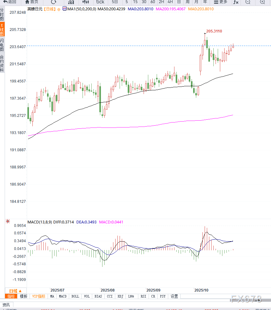 GBP/JPY在周一持续走高,因日元在市场风险偏好回暖及财政预期升温背景下继续走弱。新任日本首相计划扩大财政开支,并提高国防预算,使投资者担忧日本财政承压,从而削弱日元吸引力。 ![]() 英镑方面,英国9月零售表现及最新PMI数据明显改善,为英镑提供持续上行动力。随着英国经济韧性预期升温,资金再度回流英镑资产,对交叉盘形成助推。 日线图形上来看,GBP/JPY维持强势结构。若稳定在204.00上方,后市有望指向205.33(15个月高点),进一步突破或将打开通向208.11的空间; 但若跌破201.50的20日均线支撑,回落风险将扩大,下方关注200.68与198.87区域支撑。RSI重返60上方显示多头动能仍占优势。 ![]() 在日本财政预期偏宽松但货币政策迟滞的背景下,日元难以获得明确支撑,而英国经济数据短期仍有利于英镑。若日本央行本周仍缺乏实质性的紧缩信号,则GBP/JPY仍存在进一步走高空间。但需警惕事件风险与短线回踩压力。