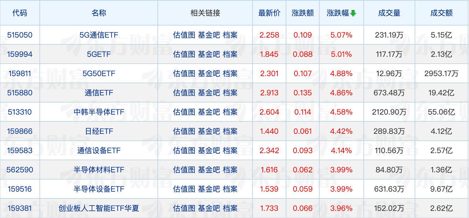 每经记者|肖芮冬 每经编辑|叶峰 天赐良基日报第753期一、今日基金新闻速览1、公募年内自购权益类基金35亿元 据统计,今年以来公募自购旗下权益类基金的规模已达到35亿元,远超去年全年水平。值得一提的是,多只新发爆款基金也频现基金管理人自购。 2、年内88只基金“一日售罄” 数据显示,以基金成立日为统计口径,截至10月25日,有88只基金在发行首日便售罄,被动指数型债券基金是绝对主力。 3、首批“翻倍基”持仓曝光 截至10月24日,年内已有超过30只基金实现翻倍收益。随着三季报陆续披露,首批“翻倍基”的持仓情况也浮出水面。从已披露的情况来看,头部“翻倍基”普遍重仓光通信、PCB、半导体等AI产业链核心环节。 二、知名基金经理最新动态1、葛兰减仓百利天恒 百利天恒最新披露的前十大流通股东名单显示,葛兰管理的中欧医疗健康混合基金现身,截至三季度末,持股数量为370.19万股,比二季度末减少57.78万股。 三、今日ETF行情点评1、ETF行情复盘 市场震荡上涨,沪指高开高走涨超1%,再创十年新高,盘中逼近4000点;深成指涨1.51%,创业板指涨1.98%。沪深两市成交额2.34万亿元,较上一个交易日放量3659亿元。板块方面,能源金属、半导体、钢铁等板块涨幅居前,而风电设备、游戏、地产等板块回调居前。 具体来看,5G、通信相关ETF全线走强,最高涨5.07%。