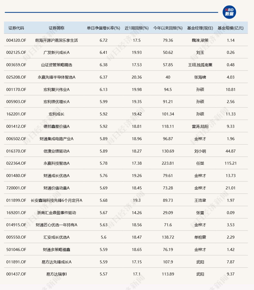 每经记者|肖芮冬 每经编辑|赵云 10月27日,市场震荡上涨,沪指高开高走涨超1%,盘中逼近4000点。板块方面,存储芯片、CPO、可控核聚变等板块涨幅居前,游戏、风电设备等板块跌幅居前。全市场超3300家股票上涨。沪深两市成交额2.34万亿元,较上一个交易日放量3659亿。 下面一起来看今天公募基金的表现。 (注:榜单1、榜单2仅选取灵活配置型、偏股混合型和普通股票型三类产品作为主动基金的代表,纳入统计;债基相关榜单包括各类主、被动债券型基金) 1.单日涨幅榜
