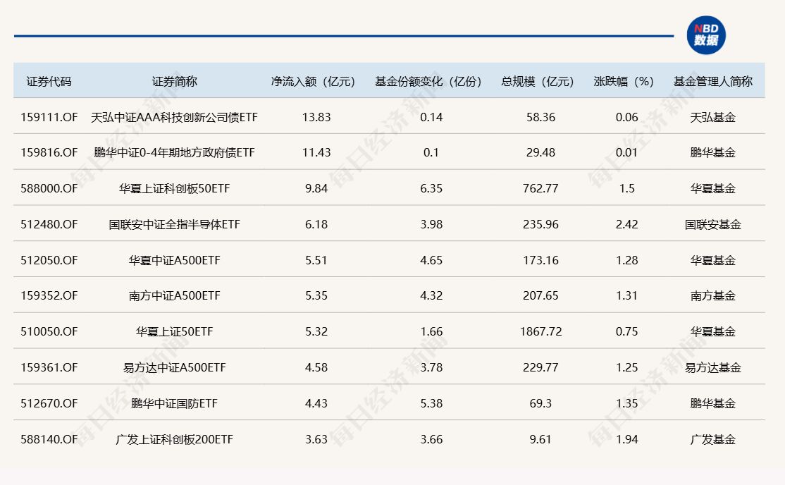 每经记者|肖芮冬 每经编辑|赵云 昨日市场震荡上涨,沪指盘中逼近4000点。板块方面,存储芯片、CPO、可控核聚变等板块涨幅居前,游戏、风电设备等板块跌幅居前。 Wind数据显示,在10月27日非货币ETF市场中,天弘中证AAA科技创新公司债ETF基金份额增加0.14亿份,净流入额为13.83亿元;鹏华中证0-4年期地方政府债ETF基金份额增加0.10亿份,净流入额为11.43亿元;华夏上证科创板50ETF基金份额增加6.35亿份,净流入额为9.84亿元。