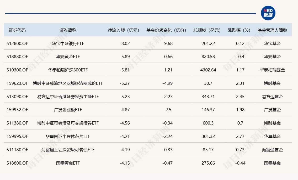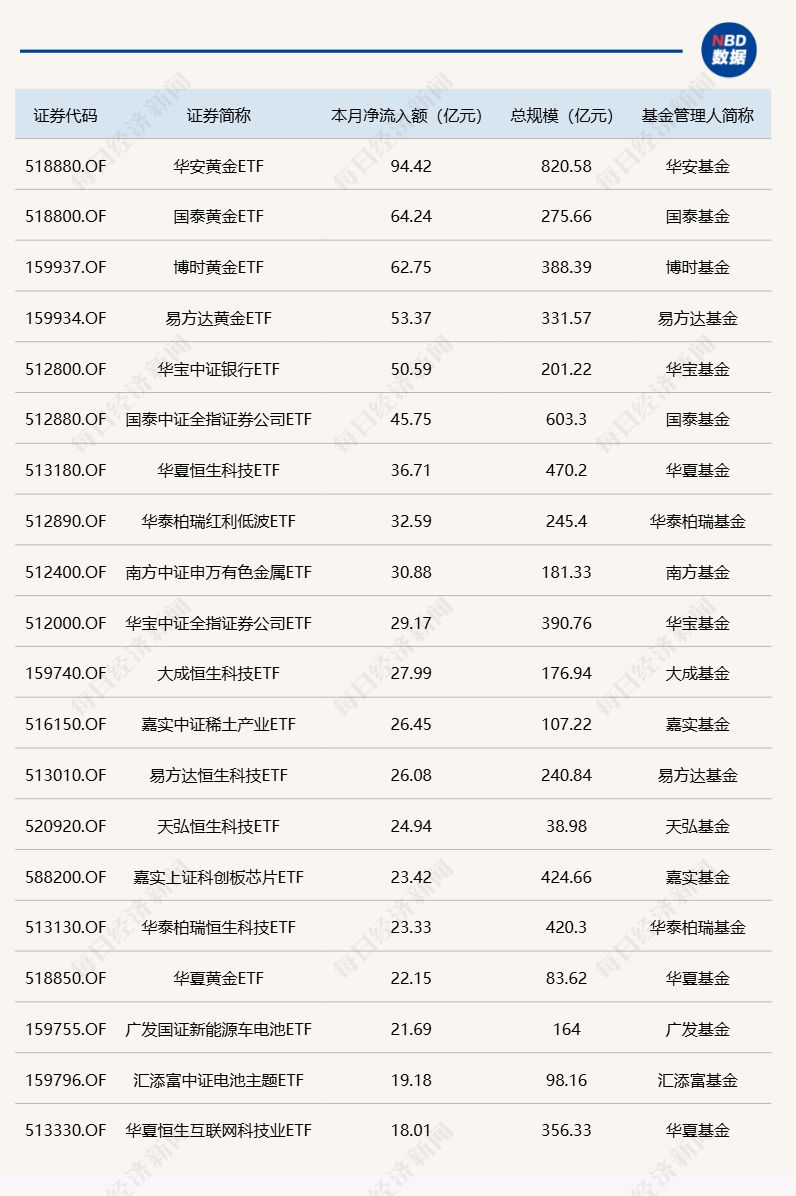 与此同时,华宝中证银行ETF基金份额减少9.68亿份,净流出额为8.02亿元;华安黄金ETF基金份额减少0.66亿份,净流出额为5.89亿元;华泰柏瑞沪深300ETF基金份额减少1.21亿份,净流出额为5.89亿元。 截至10月27日,本月资金净流入额居前20的ETF名单如下: