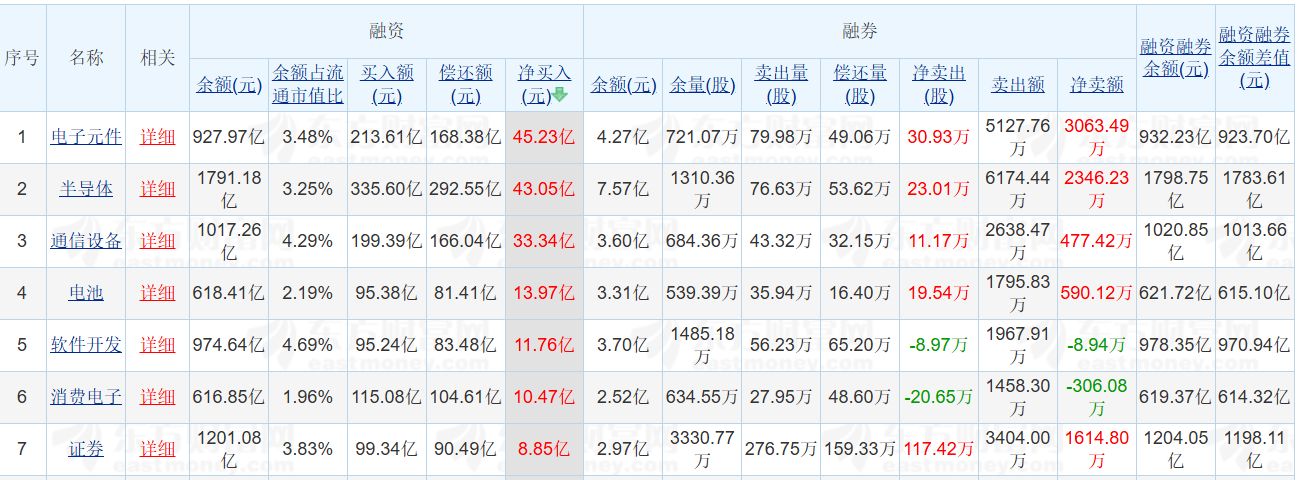 资金流向方面,当天电子元件、半导体、通信设备、软件开发占据融资净买入前五名。其中,电子元件和半导体板块融资净买入金额分别达到45.23亿元和43.05亿元。