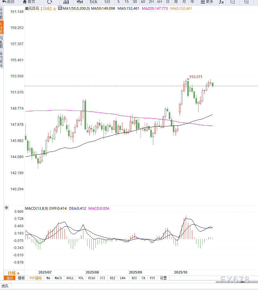 周二亚洲早盘,日元兑主要货币普遍上涨,USD/JPY自153.30高位回落至152关口下方。投资者在两大央行政策会议前调整仓位,日元空头选择阶段性获利了结。 ![]() 东京外汇研究所经济学家高桥俊介(Shunsuke Takahashi)指出: “BoJ在通胀持续上行的背景下面临政策调整压力,而木内的表态暗示政府不愿看到过度贬值,这为日元提供了短线支撑。” 美国方面,市场普遍预计美联储将在为期两天的政策会议结束后宣布降息25个基点至3.75%-4.00%区间。此外,投资者已基本消化年内再降息一次的可能性。 该预期压制美元买盘,使得美元兑日元的上行动能减弱。 然而,日元的涨势仍受到新首相高市早苗的财政政策立场制约。 高市以其“积极财政刺激”立场著称,她已表示将通过扩张性支出计划提振经济增长,这或延缓BoJ进一步收紧政策的进程。 市场将密切关注日本央行本周四的政策更新,以寻求12月加息的信号。 从技术角度看,USD/JPY短线呈现高位回落格局。价格在53.30附近遭遇明显阻力,若跌破152.00整数位支撑,将打开进一步下行空间,目标指向151.50附近,若该区间失守,或将下探151.00关口。 上行方面,初步阻力位于153.00附近,其后依次为153.30与154.00。若多头重新掌控节奏,价格或延伸至154.50及155.00心理关口。 RSI回落至中性区下方,MACD出现死叉迹象,短线偏空信号增强。 ![]() 当前日元的走势呈现出“政策预期与干预预期交织”的复杂格局。 政府官员的表态虽短暂提振了日元,但高市早苗的财政扩张计划意味着货币政策收紧空间有限。 若本周日本央行暗示未来加息路径,日元或迎来阶段性走强;反之,若政策基调偏鸽,汇率可能重返153上方。 总体而言,本周的双央行会议将成为决定美元/日元方向的关键催化剂,市场短线波动风险显著上升。