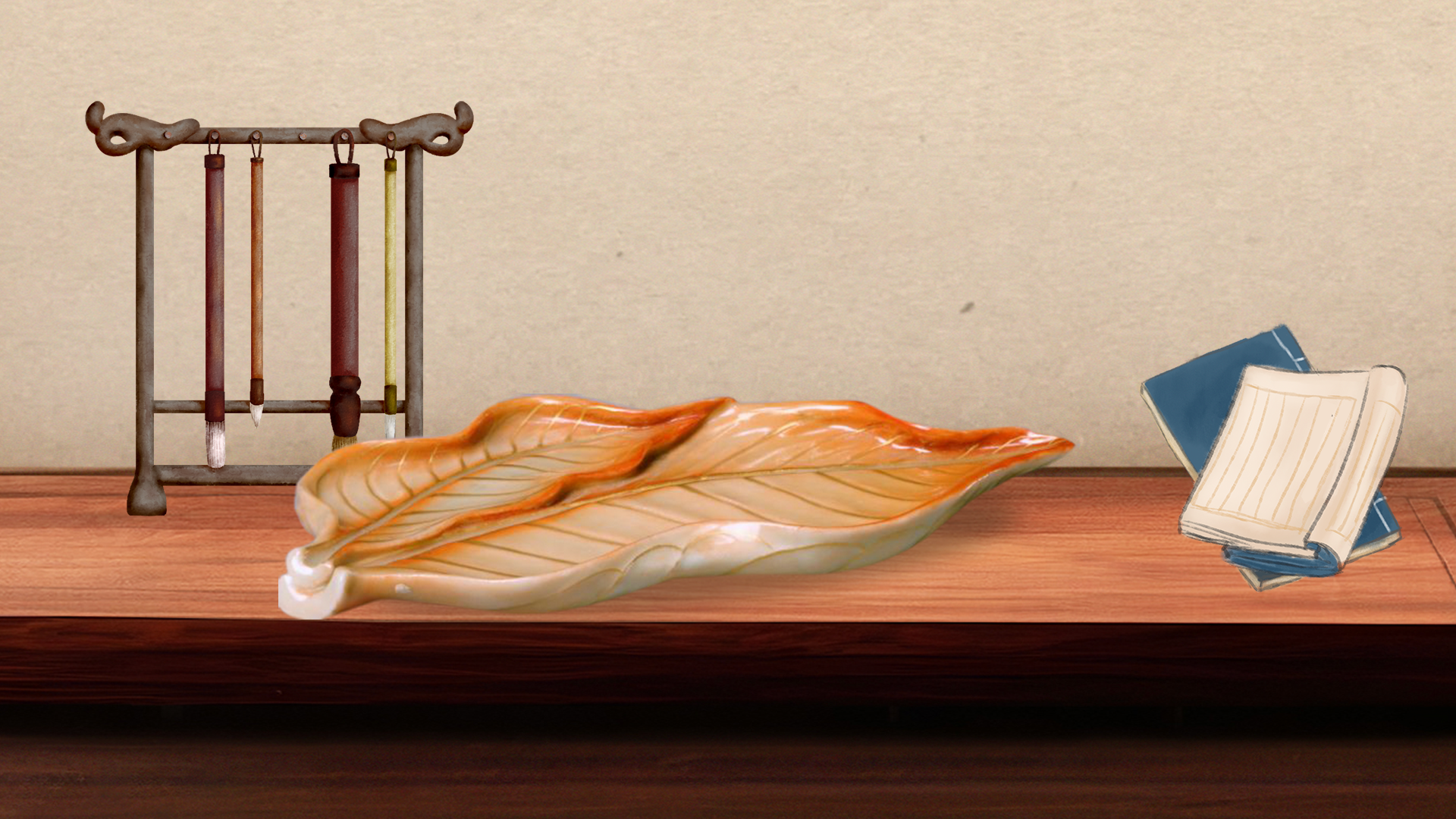 这件形似叶子的文物 其实是文房用具笔掭 它通体施黄釉 釉面莹亮 器面的叶脉描画清晰并以描金装饰 器底也雕出了叶背脉络