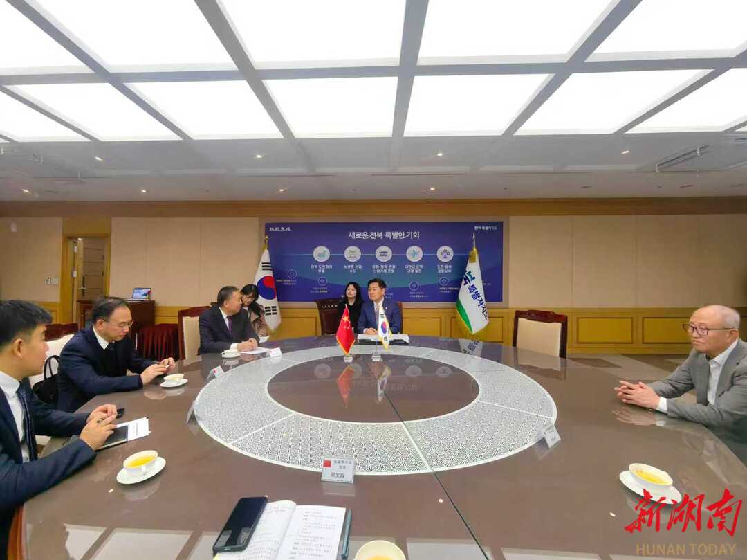 毛万春与全北特别自治道知事金宽永会谈。 访问期间,毛万春一行分别会见了韩国国会议员李基宪,全北特别自治道知事金宽永、议长文承宇,仁川广域市议长丁海权,韩国市道知事协议会事务总长庾敏凤等,并参访全北特别自治道文化观光财团。每到一处,毛万春都积极宣传推介湖南。他说,近年来,湖南正按照习近平主席指引的方向、擘画的蓝图,全力打造国家重要先进制造业高地、具有核心竞争力的科技创新高地、内陆地区改革开放高地。湖南与韩国合作基础雄厚,交流交往密切,期待在中韩战略合作伙伴关系大框架下,湖南与韩国秉持互尊互信、互利共赢,进一步加强经贸往来、拓展文旅合作、促进青少年交往交流、深化产业协同,从推动智慧社区建设、加强湘韩就业对接、联合研发中药及森林康养产品、加大农产品精深加工领域合作、深化人文互动交流等多方面发力,将双方的交流合作提升至更高水平、更宽领域、更深层次的新阶段。