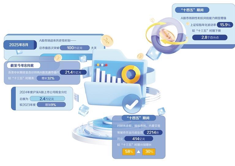 2025年8月,A股市场迎来历史性时刻——总市值首次突破100万亿元大关。这个数字不仅是市场规模的增长,背后更是“十四五”时期我国资本市场从制度构建到功能升级的全方位深刻蜕变。 融资与投资协调推进,执法更严、透明度更高,投资者信心持续增强,市场韧性和服务实体经济的能力显著提升……中国资本市场正以更加成熟的姿态,为经济高质量发展注入澎湃动能。 基本确立“四梁八柱”框架 2024年国务院发布新“国九条”,明确提出打造安全、规范、透明、开放、有活力、有韧性的资本市场。此后,60余项配套规则陆续推出,成为新一轮系统性的制度重构,标志着资本市场监管的底层逻辑正在发生深刻变革。 “十四五”期间,资本市场法治建设迎来“爆发期”。以新证券法实施为契机,对相关法规制度进行系统“立改废释”。十年磨一剑,《中华人民共和国期货和衍生品法》正式实施,标志着我国资本市场法制体系的进一步完善,给期货市场的发展装上了“导航系统”,让风险管理更加规范。2023年出台的《私募投资基金监督管理条例》填补了监管空白,合规经营的私募机构迎来了发展春天。这些重要法律法规的落地,正是资本市场“四梁八柱”法规制度体系建构成型的缩影,中国特色的资本市场法治体系进一步健全。 监管层面,全面实行注册制,证监会推行“以信息披露为核心”的监管理念,强化中介机构责任,压实发行人主体责任,完善退市制度,“十四五”时期共207家公司平稳退市。健全投资者保护机制,资本市场优胜劣汰的市场约束机制正在形成。 目前,我国债券市场规模居全球第二位,期货成交量稳居全球第一位,公募基金管理规模突破36万亿元,资本市场的广度和深度得到显著提升。多层次、广覆盖的市场体系更加完备。主板、科创板、创业板、北交所构成了多层次资本市场,满足从“蓝筹龙头”到“专精特新”的不同融资需求。纵深推进科创板、创业板改革,成功设立并高质量推进北京证券交易所建设。北交所成立以来,截至10月10日,已有278家上市公司,累计融资超500亿元,成为服务创新型中小企业的主阵地。持续深化新三板改革,稳步发展结构合理、功能互补的多层次股权市场。交易所债券市场产品日趋丰富,公募REITs、科创债、资产证券化等创新品种加快发展。全市场期货期权品种达到157个,广泛覆盖国民经济主要产业领域。设立广州期货交易所,更好促进绿色发展。 市场结构优化在市值分布上体现得尤为明显。10年前金融、地产等传统行业市值占比超50%。而目前A股科技板块市值占比超过四分之一,已明显高于银行、非银金融、房地产行业市值合计占比。市值前50名公司中,科技型企业从“十三五”时期末的18家提升至当前的24家。截至2025年8月22日,电子行业以11.54万亿元的总市值首次超越银行业,成为A股市场第一大行业。2024年以来,电子、电力设备、通信、计算机四大科技板块合计贡献市值增量超16万亿元,占全市场增量的39%。宁德时代、工业富联等一批科技型企业跻身“万亿市值俱乐部”,标志着资本市场与产业升级的同频共振。 投资者结构在悄然重塑。中长期资金加速入市,社保、险资、外资资金共同构建了“稳定器”力量。截至今年8月底,各类中长期资金合计持有A股流通市值约21.4万亿元,较“十三五”时期末增长32%。高盛、摩根大通等国际机构纷纷上调A股至“超配”评级。人民币资产被国际机构视为“新型避险资产”。 跑出科技加速度 资本市场服务科技创新,跑出“加速度”。A股市场含“科”量进一步提升。近年来,新上市企业中九成以上都是科技型企业或者科技含量比较高的企业。以科创板为例,开市6年来,截至7月22日,这个中国资本市场最年轻的板块已经拥有589家上市公司,超7万亿元总市值,培育的“硬科技”迎来“井喷期”,超60家公司推出全球首创性产品;三成公司的产品、在研项目具有首创性;超六成公司的850多项产品、技术达到国际先进水平,科创板公司平均研发强度保持在10%以上。科创板上市公司IPO和再融资募集资金合计超1.1万亿元,新一代信息技术、生物医药、高端装备制造等新兴产业公司占比超八成。中芯国际、寒武纪等一批硬科技企业通过资本市场获得强大的发展动能。 全面注册制改革让资本市场更加包容创新型企业。从初创期的硬科技公司到成长中的“专精特新”企业,再到产业链龙头,通过直接融资获得发展动能,形成了以资本市场为核心的创新资本循环体系。 直接融资比例是衡量资本市场成熟度的重要指标。直接融资比重稳中有升,较“十三五”时期末提升2.8个百分点,达到31.6%,这意味着资本市场正在成为支持科技创新的“主引擎”。 资本市场的另一端投资端,底层逻辑也在变化。分红与回购成为企业治理的重要手段。2024年沪深A股上市公司现金分红总额为2.4万亿元,较2023年增加9%。公募基金、社保基金、保险资金等长期资金入市比例稳步提升。截至2024年底,公募基金规模突破36万亿元,成为市场“稳定器”和“价值发现者”。个人投资者结构也趋于理性化,投资理念逐步从“炒题材”转向“看业绩、看治理、看分红”,体现了成熟市场的理性特征。 资本市场不仅要帮助企业融资,更要让投资者分享发展红利。数据显示,5年来,上市公司通过分红、回购派发“红包”合计达到10.6万亿元,比“