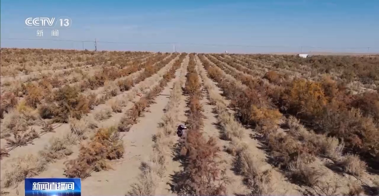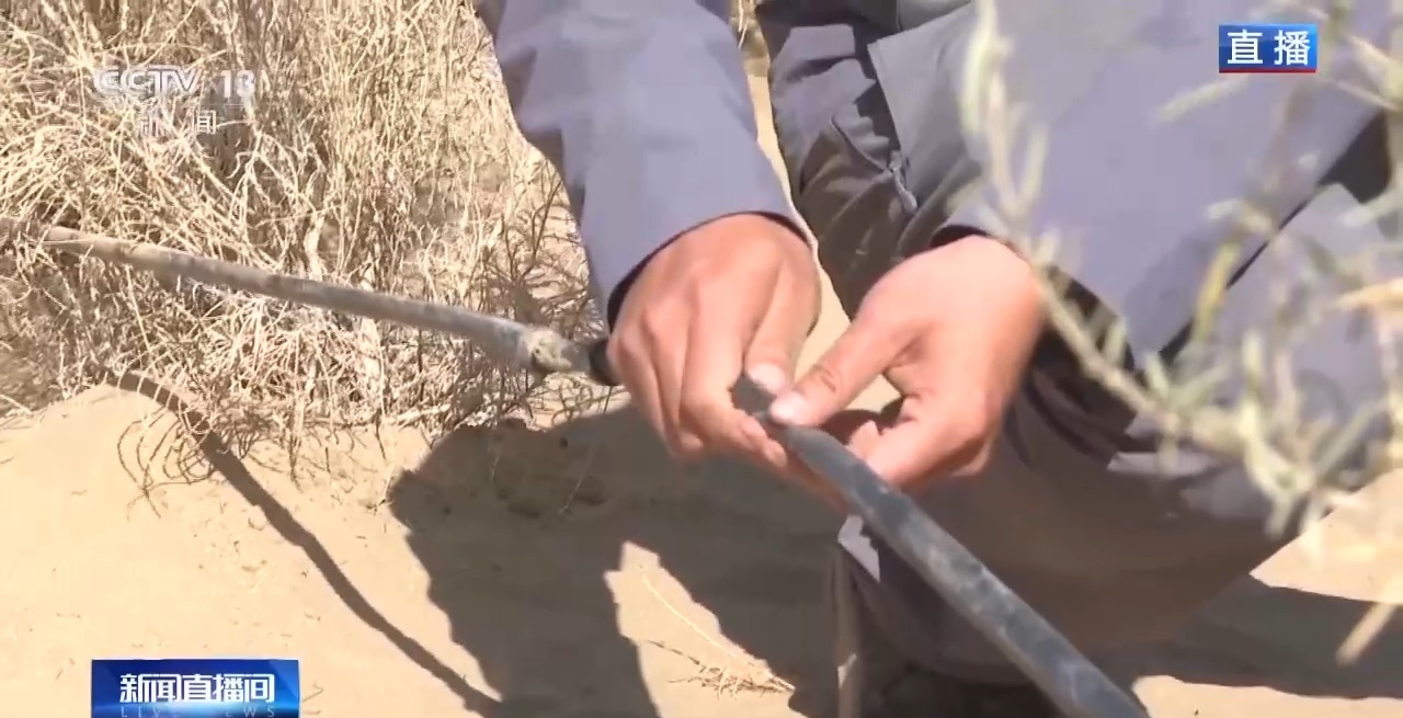 这里的肉苁蓉能有这样好的品质,离不开生态林的养护。种植肉苁蓉的这片防沙林,在三年前还是一片荒漠。在沙漠中,能出现这样的生命奇迹,得益于当地科学用水。在每一行的梭梭和红柳的根部都有滴灌带,因为现在是肉苁蓉采收季,所以滴灌带里没有水。这些滴灌设施,在沙漠里发挥节水灌溉的作用,让生态林扎根成活,让肉苁蓉得以生长。