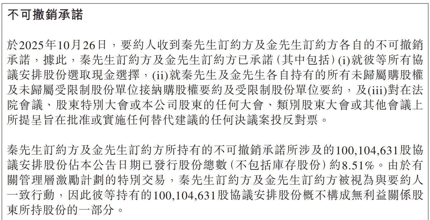 图片来源:安能物流公告 值得注意的是,根据公告,公司创始人兼CEO秦兴华、首席运营官金云等核心管理层已作出不可撤销的承诺,不仅支持本次私有化,更承诺将其合计持有的约8.51%股份全部接受现金选择,并以投票方式助力交易通过。私有化完成后,新的控股平台TopCo计划设立管理层激励计划,以绑定核心人才与公司的长远利益。 公告披露,秦兴华目前共持有安能物流约9710万股股份。根据公告,在私有化方案实施时,他将选择全额收取现金对价,而不会换取新控股公司的股份。以每股12.18港元的私有化价格计算,秦兴华将获得约11.83亿港元的现金。 更为引人关注的是秦兴华职位的重大调整。公告明确,自私有化正式生效之日起,秦兴华将调任为公司的高级顾问。这意味着,秦兴华将不再担任安能物流的执行董事、联席主席、首席执行官及总裁等所有核心管理职务。 公告同时提到,此次私有化仍需跨越几道关键门槛:交易达成的前提条件包括获得国家市场监督管理总局等监管机构的批准,以及在法院会议和股东特别大会上获得无利益关系股东的法定多数支持,并最终获得开曼群岛大法院的认许。 安能物流已向联交所申请股份自10月30日上午9时起恢复买卖。届时,市场将对此份溢价收购要约作出首次反应。标志着交易进入下一阶段的综合协议安排文件,将在切实可行的情况下尽快寄发给股东。 私有化逻辑:摆脱短期业绩压力,聚焦长期战略布局公告阐述了安能私有化的核心逻辑,具体原因为,尽管安能物流已成功调整经营策略并取得行业领先的盈利能力,但在宏观环境挑战和激烈市场竞争下,公司股价自2021年11月上市以来长期承压。同时,股份交易流动性持续处于低位,股东难以在不对股价造成重大折让的情况下大规模减持。 公告显示,退市后,安能物流将得以摆脱资本市场的短期业绩压力和繁重的上市合规成本,从而在实施可能影响短期财务表现、但有利于长期竞争力的战略决策时获得更大灵活性。公司将能更专注于核心业务运营和长远发展。 2021年11月11日,安能物流于港交所正式敲钟上市。自上市以来,安能物流曾深陷危机。过往财报显示,2021年安能物流经调整后的净利润亏损超20亿元;2022年,其经调整净亏损达2.18亿元。直到2023年,安能物流全年利润成功扭亏为盈。