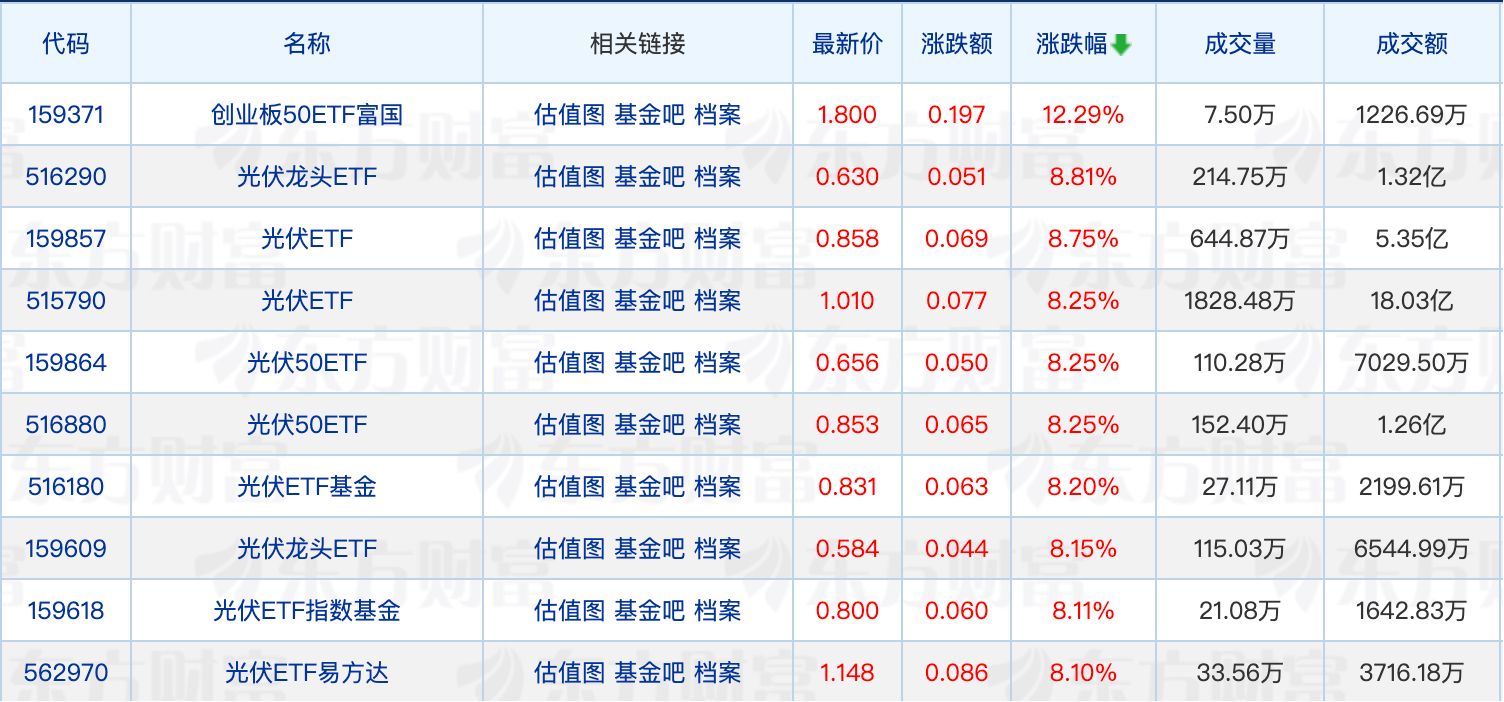 每经记者|肖芮冬 每经编辑|叶峰 天赐良基日报第755期一、今日基金新闻速览1、崔春出任华泰柏瑞基金总经理 10月28日,华泰柏瑞基金发布公告,任命前华泰证券资管董事长崔春为公司总经理,董事长贾波不再代行总经理职责。 2、两家公募指数基金规模破万亿元 公开数据显示,截至三季度末,非货币ETF、ETF联接基金及其他场外指数基金规模合计约8万亿元。值得关注的是,有两家公募的指数产品规模超过万亿元——易方达基金以约1.11万亿元规模领跑;华夏基金紧随其后,规模约为1.08万亿元。 3、首批浮动费率基金“成绩单”来了 首批新型浮动费率基金在今年6月和7月接连公告成立。截至10月27日,首批26只基金平均涨幅约为14.3%,但因基金经理布局锚定不同的方向,这批基金的业绩已经出现了分化。其中,涨幅最高的基金成立以来上涨53.58%,而排在末尾的基金同期则亏损超3%。 二、知名基金经理最新动态1、葛兰加仓百普赛斯 百普赛斯最新披露的前十大流通股东名单显示,葛兰管理的中欧医疗创新股票基金首次现身,持股数量为206.14万股。此外,葛兰和赵磊共同管理的中欧医疗健康混合基金也现身百普赛斯前十大流通股东名单,持股数量比二季度末增加277.81万股。 三、今日ETF行情点评1、ETF行情复盘 市场全天震荡拉升,三大指数高开高走,创业板指涨近3%创年内新高,沪指再度回升至4000点上方。沪深两市成交额2.26万亿元,较上一个交易日放量1082亿元。板块方面,能源金属、光伏设备、有色等板块涨幅居前,而银行、酒类、文化传媒等板块回调居前。 具体来看,创业板50ETF富国领涨12.29%。光伏板块爆发,隆基绿能、通威股份等多股涨停,光伏相关ETF集体走强,多只产品涨幅超过8%。