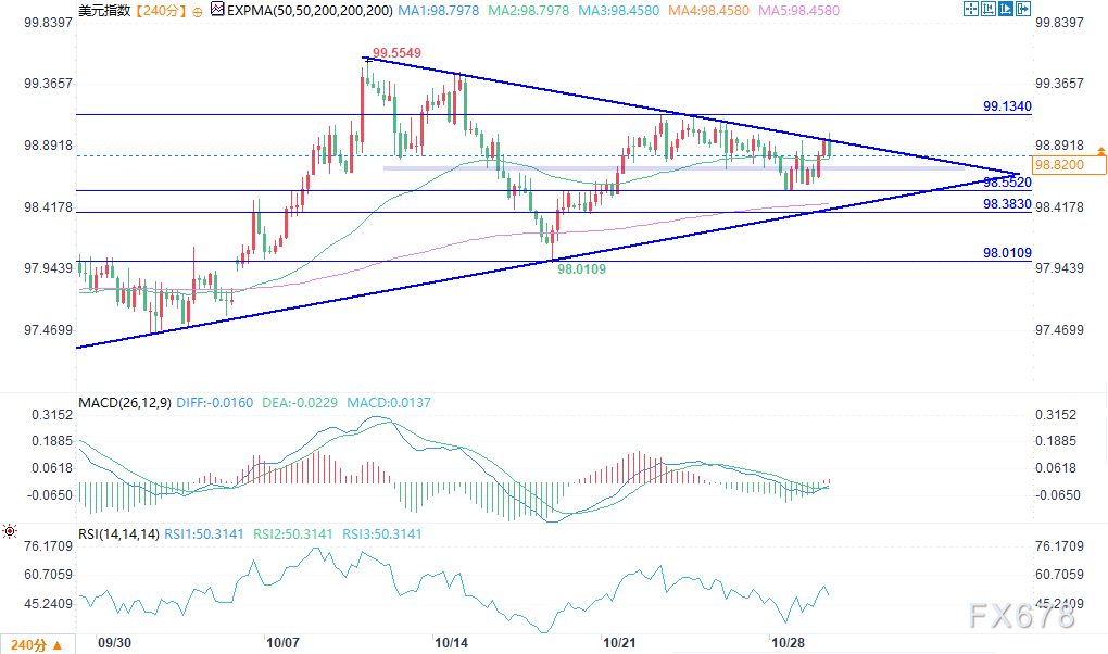 0周三(10月29日)欧盘时段,美元指数(DXY)目前交投于98.858附近,价格先抑后扬,早盘一度下探至约 98.62 附近,随后展开反弹,午后冲高至接近 99.00的日内高点,目前有所回落但仍保持在相对高位。 周二公布 ...