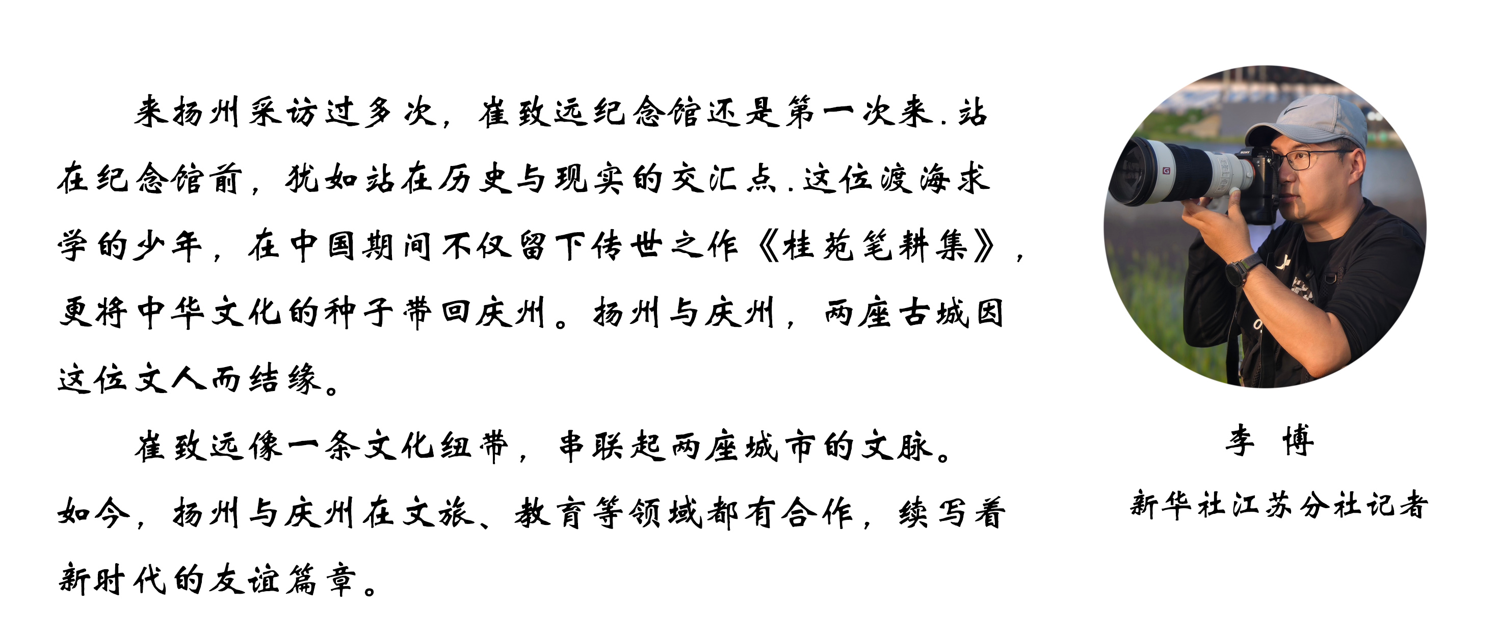 庆州,是崔致远的故乡 扬州,则是他人生中闪耀的舞台 两座城市因崔致远结缘 千年之后 这段跨越国界的文化佳话在两座古都间延续 自2000年前后,扬州与以韩国庆州崔氏中央宗亲会为代表的韩国各界友好人士持续开展交流合作。 此后的每年10月15日,庆州崔氏中央宗亲会组织的代表团几乎都会来到扬州举行祭祀活动。扬州市政府将这一天定为“中韩友好交流日”。2007年10月,扬州崔致远纪念馆建成开放。2008年,庆州和扬州结为友好城市,两城在文化、旅游、青少年、学术等领域交流密切。