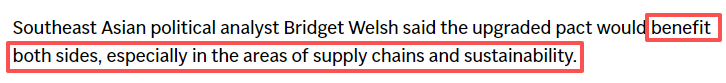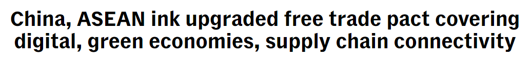 美联社(AP)网站报道截图 报道还援引分析师的话说,中国与东盟都能在升级后的自贸协定中获益,特别是在供应链和可持续发展领域。 “为所有人带来持久利益” 亚洲新闻台的报道说,中国与东盟签署的自贸区3.0版升级议定书旨在建立长期的经济韧性并加强经济一体化。