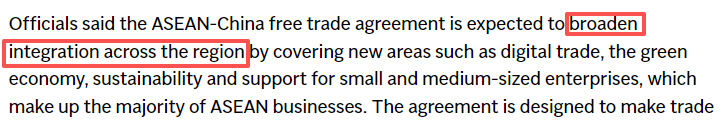 美联社(AP)网站报道截图 报道援引东盟官员的话说,东盟-中国自贸区3.0版预计将通过数字贸易、绿色经济、对中小企业(占东盟企业主体)的持续性支持来扩大区域一体化。该协定旨在扩大贸易优惠体系,改善小型企业市场准入,简化非关税程序并降低监管壁垒。