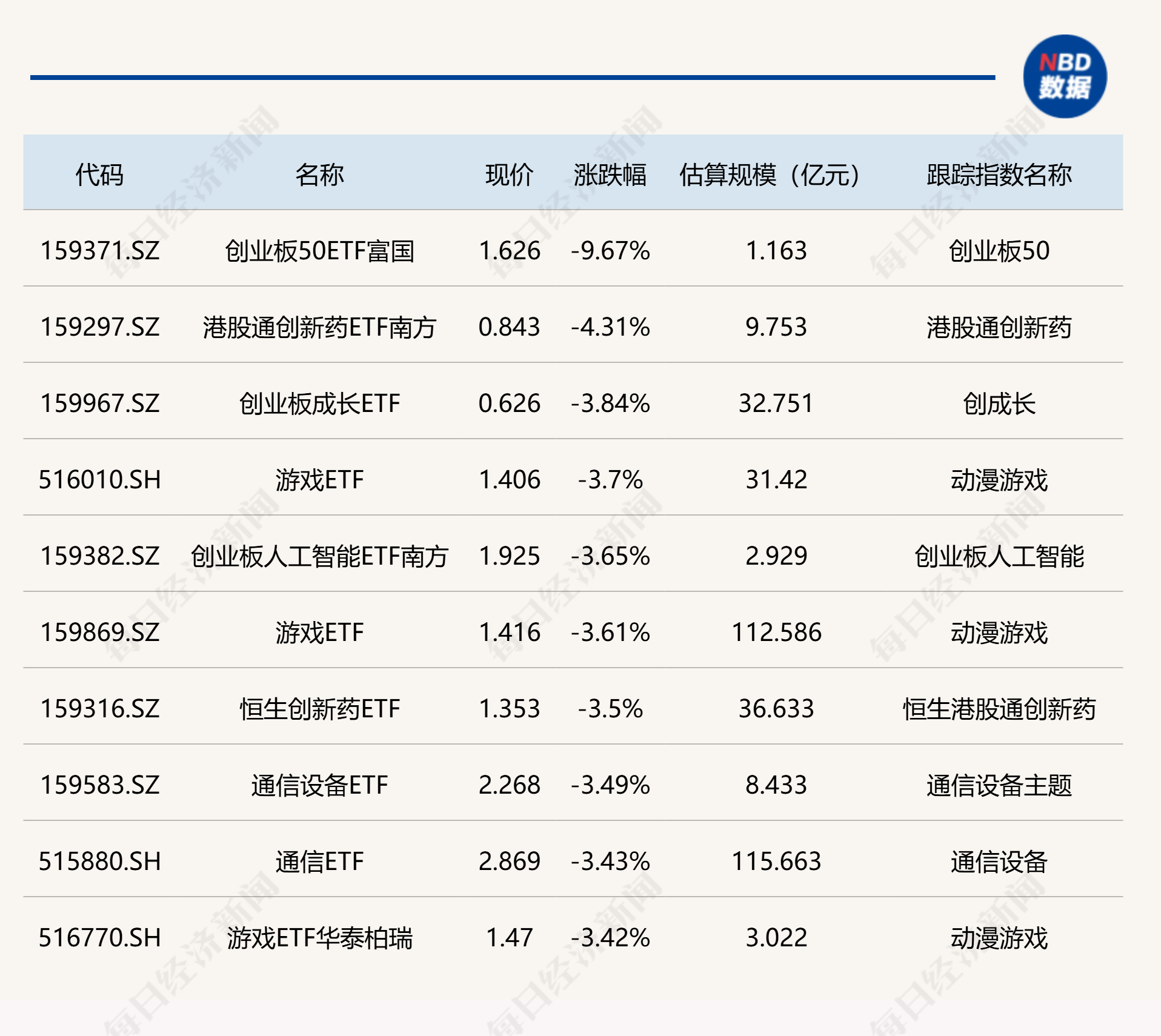 有分析认为,战略小金属储量有限、开采难度大且供给弹性不足,同时新能源、半导体、军工等下游需求快速增长,供需矛盾加剧。在资源稀缺性持续凸显、需求结构升级及政策调控下,未来稀有金属价格有望延续上行趋势,具备资源储量优势、技术壁垒及合规出口渠道的企业将持续受益。 下跌方面,创业板50ETF富国跌超9%,游戏ETF跌超3%。