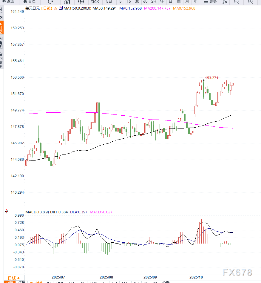 在BoJ按预期决定维持政策利率不变之后,日元短线虽吸引部分卖盘,但整体走势乏力。市场参与者普遍采取观望策略,等待10月政策会后行长的新闻发布会,关注其对未来加息可能性的表态。 ![]() 美元方面,美联储近期按预期降息25个基点,并表示12月进一步降息并非板上钉钉,同时宣布年底结束缩表计划。 这在一定程度上限制了美元进一步下行空间,同时为USD/JPY提供支撑。 整体来看,USD/JPY在153.00附近承压,短期多空力量交织,市场观望情绪仍占主导。关注BoJ新闻发布会及全球贸易动态对日元短线波动的潜在影响。 日线图显示,USD/JPY持续受153.30关键阻力区压制,若进一步突破可上探154.00及154.80区域,最终挑战155.00心理关口。下方支撑位于152.00,如失守,将进一步测试151.50前低,跌破后可能延伸至151.00。 MACD指标在零轴附近徘徊,RSI维持在中性区域,显示短线多空博弈激烈,盘面仍需谨慎。 ![]() 短期来看,USD/JPY受BoJ维持利率不变以及市场对未来加息节奏的观望情绪影响,走势偏向震荡整理。短期保持谨慎,关注BoJ行长新闻发布会、全球贸易动态及美元政策声明对日元的短期冲击。