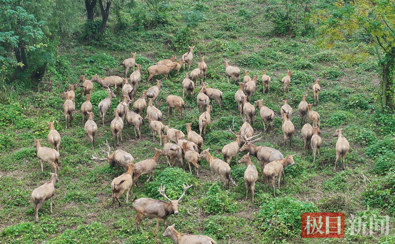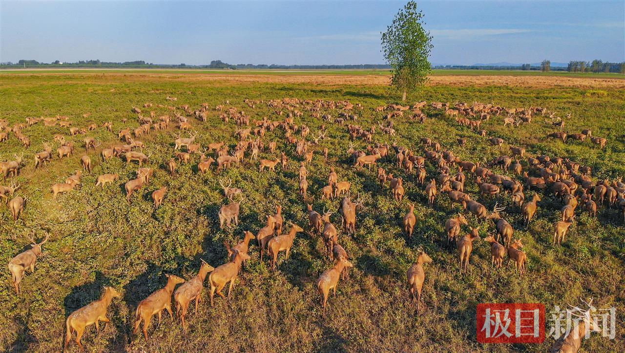10月29日,在石首麋鹿国家级自然保护区,成群麋鹿在悠闲觅食(极目新闻记者 李辉 摄) 30多年来,石首麋鹿保护区已经发展到4500余头,其中保护区内2901头,周边三合垸、杨波坦和洞庭湖等地自然扩散1600余头,遍布两湖流域的两省九县市,形成了全球最大的野生麋鹿种群,被联合国教科文组织称为“全球濒危物种保护领域的成功范例”,成为湖北长江大保护的一张亮丽名片。