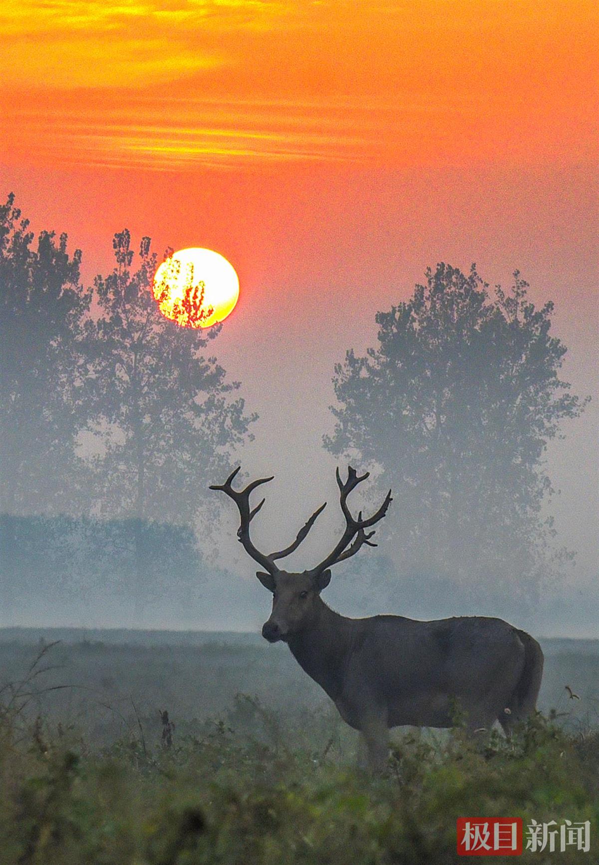 石首麋鹿国家级自然保护区,一头麋鹿在朝阳下觅食(极目新闻记者 黄志刚 摄) 先秦时期,墨子曾在《公输》中有言:“荆有云梦,犀兕麋鹿满之。”这表明,当时楚国的云梦泽,犀牛、麋鹿成群,长江流域生物多样性之丰富可见一斑。 史料记载,至晚清,由于狩猎、自然灾害和时局战乱等因素,麋鹿在其原生地中国几近灭绝,只有少量种群流落海外。 1985年,《中英关于麋鹿重引进的协议》签署,22头麋鹿乘飞机从英国抵达北京,其中20头送至北京南海子清代皇家猎苑,另2头赠予上海动物园。 今年正值麋鹿回归40周年。经过多年人工繁育和野化放归等保护举措,麋鹿种群已在北京、江苏、湖北等6个区域恢复重建野外种群,栖息地数量达到92个,种群数量达1.5万头,种群数量居全球第一。