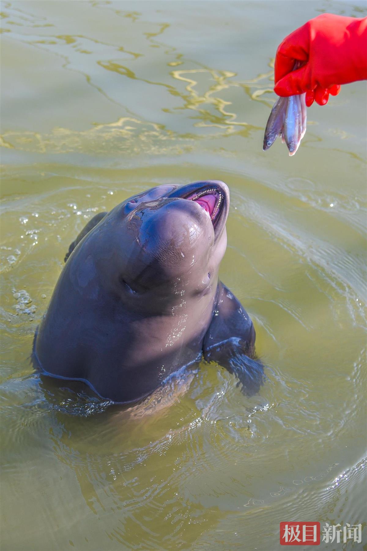 江豚在摄食(极目新闻记者 黄志刚 摄) 从江豚幼崽就开始全人工喂养,这是全世界没有的先例,丁泽良决定尝试。为了教“萌萌”进食,丁泽良挑选了新鲜小鱼。 一条、两条、三条……半个月时间,丁泽良引导“萌萌”学会了摄食技能。心情愉悦的丁泽良还跟“萌萌”开玩笑,亲切地称呼它“小帅哥”。 为了避免近亲繁殖导致江豚种群退化问题,提高遗传多样性,优化长江江豚迁地群体结构,保护区还与长江流域的安庆、铜陵等其他迁地保护区进行江豚种群基因交换。