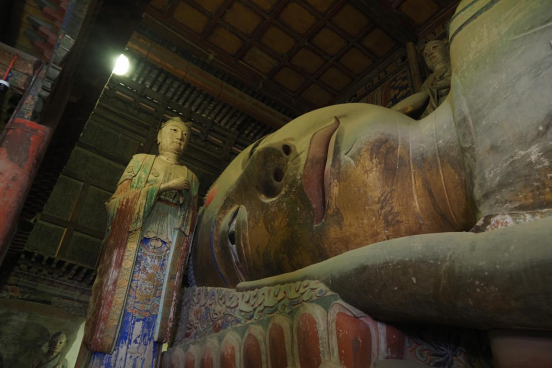 大佛寺 中国网记者曹川川/摄 张掖的壁画瑰宝,集中藏于石窟寺与古建筑之中,张掖大佛寺便是其中的璀璨明珠。这座始建于西夏崇宗永安元年(1098年)的寺院,拥有全国最大的西夏佛教殿堂卧佛殿,同时保存着530余平方米的珍贵壁画。大殿正中,34.5米长的释迦牟尼涅槃泥塑卧佛静静“安睡”,其木头骨架、草泥贴塑的独特构造,见证着古代工匠的智慧。