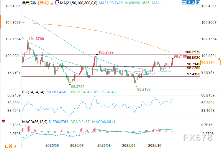0周四(10月30日)交易时段,美元指数触及8月初以来的最高水平,短暂突破10月9日的震荡高点99.563后,在99.724附近遇阻。周三的上涨势头延续至早盘,交易员对美联储的最新信号及交叉货币的走弱作出回应。 98.7 ...
