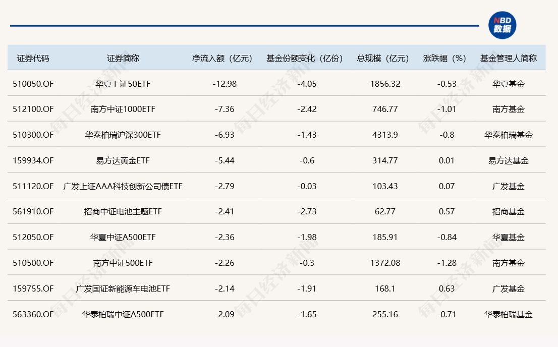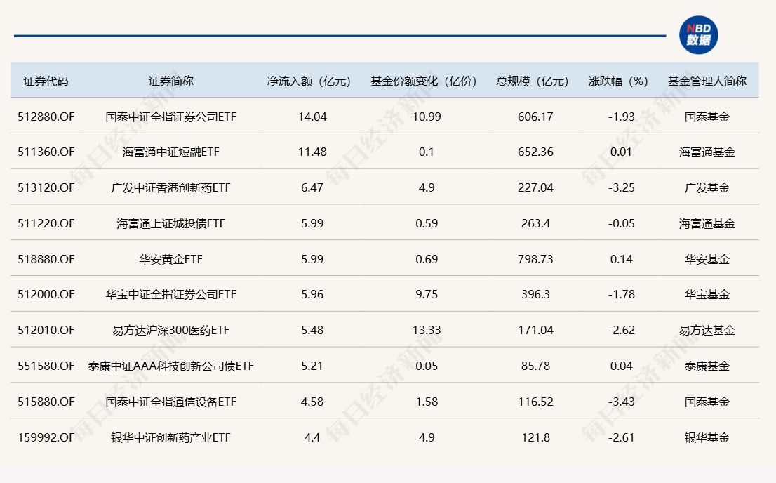 | 每经记者|肖芮冬 每经编辑|赵云 昨日市场震荡调整,三大指数盘中均出现跳水,创业板指跌近2%,沪指失守4000点。板块方面,能源金属、钢铁、量子科技、电池等板块涨幅居前,CPO、游戏、煤炭等板块跌幅居前。 Wind数据显示,在10月30日非货币ETF市场中,国泰中证全指证券公司ETF基金份额增加10.99亿份,净流入额为14.04亿元;海富通中证短融ETF基金份额增加0.10亿份,净流入额为11.48亿元;广发中证香港创新药ETF基金份额增加4.90亿份,净流入额为6.47亿元。