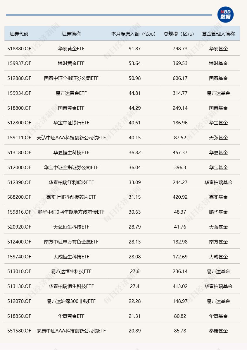 与此同时,华夏上证50ETF基金份额减少4.05亿份,净流出额为12.98亿元;南方中证1000ETF基金份额减少2.42亿份,净流出额为7.36亿元;华泰柏瑞沪深300ETF基金份额减少1.43亿份,净流出额为6.93亿元。 截至10月30日,本月资金净流入额居前20的ETF名单如下: