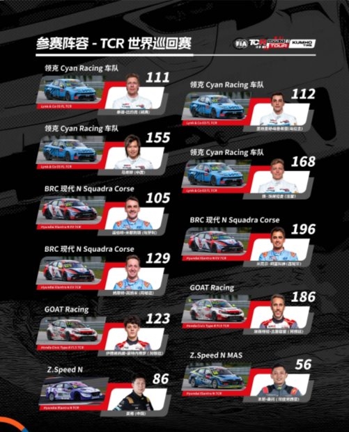本次株洲站的参赛阵容堪称 “星光熠熠”,众多世界顶级车手将齐聚湘江之畔,展开激烈竞逐。其中包括两届 TCR汽车世界巡回赛冠军 Yann Ehrlacher、2017年WTCC世界冠军 Thed Biork、TCR汽车世界巡回赛分站冠军 Santiago Urrutia、以及备受中国车迷关注的本土冠军车手马青骅、上赛季卫冕冠军 Norbert Michelisz 等名将,他们的同场竞技将成为赛事最大看点之一。此外,赛事阵容还迎来全新亮点:澳大利亚超级房车赛卫冕冠军 Will Brown 将火线加盟,取代 Josh Buchan 出战;中国香港车手卢思豪也将升级座驾,从之前的老款 i30N 赛车换为现代伊兰特赛车,以全新配置迎接挑战。