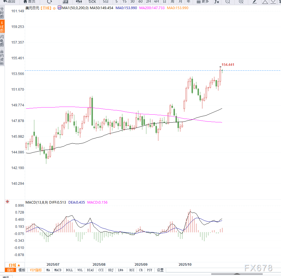 日本总务省周五公布数据显示,东京10月消费者物价指数(CPI)同比上升至2.8%,高于前值2.5%;剔除生鲜食品后的核心CPI亦升至2.8%。 ![]() 央行行长植田和男在会后表示,目前尚无下一次加息的既定时间表。该表态被市场视为“谨慎鹰派”立场,显示央行在物价压力与财政扩张之间保持平衡。 市场关注的新焦点在于新任首相高市早苗的财政政策取向。她计划推出积极财政支出方案以支持国内经济复苏。市场认为,若财政刺激力度扩大,日本央行可能选择延后加息,以避免政策冲突。 东京一位投资机构分析师指出: “财政扩张与通胀上升的并行,使得货币政策调整变得更为复杂,这正限制日元的上涨空间。” 美联储本周第二次降息,将联邦基金利率区间下调至3.75%-4.00%。但主席鲍威尔强调,12月是否再次降息“尚未确定”。 这令市场削减对进一步宽松的押注,推动美元指数触及自8月以来的高点,并带动美元兑日元升至八个月新高。 然而,美国政府停摆已进入第五周,国会对拨款法案的僵局令经济前景蒙上阴影,从而抑制美元多头情绪。 从技术图形来看,美元兑日元在153.30上方企稳,该区域由前期高点转化为支撑。日线震荡指标维持在积极区间,尚未进入超买状态,暗示短线仍有上行动力。 若价格稳步突破154.80区域,将有望进一步上探155.00心理关口。 若跌破154.00,下方支撑位集中在153.25至153.00整数位;一旦失守,或引发更深回调,目标指向152.15-151.50区间。 技术分析师指出: “只要汇价守稳153.25支撑,短线趋势仍偏向上行,但若跌破该位,将触发短期修正。” ![]() 日元走势正受多重政策信号牵制:东京通胀数据为加息提供依据,但财政扩张与政策不确定性削弱其升值动力。短期内,美元兑日元或继续在153至155区间内震荡。若美联储12月释放更强烈的宽松信号,日元才可能迎来阶段性反弹。 总体而言,当前市场处于观望状态,关注日本央行11月前的政策指引与美元走势的联动情况。