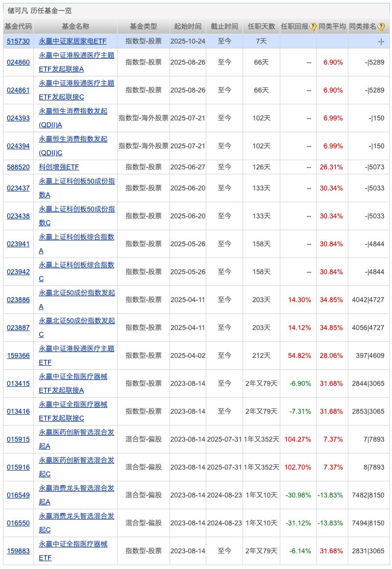 2、基金简称:永赢中证家居家电ETF 基金类型:股票型证券投资基金、指数基金 基金经理:储可凡 业绩比较基准:中证家居家电指数收益率 基金经理过往业绩: