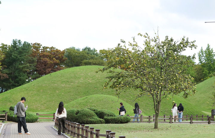 10月17日,游人在韩国庆州的大陵苑一带参观。新华社记者姚琪琳摄 庆州市中心的大陵苑是1000多年前新罗王朝时期的墓葬群,这里共有20多座王陵与贵族墓,隆起的“土堆”错落有致,构成一片静默的波浪。草坡的绿意仍在延续,枝头的柿子却已被秋阳染成金黄。一树一丘,一黄一绿,如油画般层次分明,古老的王陵在这柔和的色调中更显宁静和浪漫,恰是庆州秋天最静美的时刻。 这座古老的小城,正在迎来新的关注。