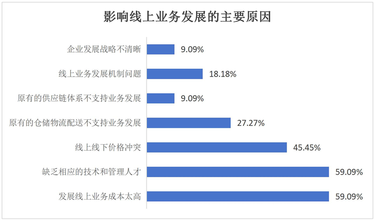 尽管如此,新渠道的增长潜力已初步显现——36.4%的直播企业实现销售额占比同比提升,部分餐饮企业通过直播推广团购券,单场直播可带动线下到店消费增长20%。与此同时,瓶颈也十分明显:59.09%的企业反映线上业务面临“成本高、缺人才”的双重压力,包括平台服务费、配送成本及数字化技术人才短缺;45.45%的企业遭遇线上线下价格冲突问题,担心线上低价促销冲击线下门店客流,制约了新渠道的规模化发展。